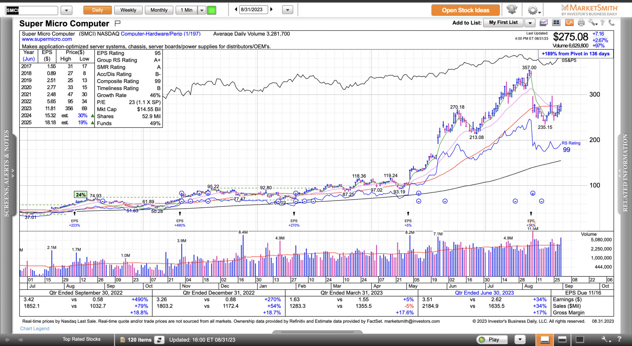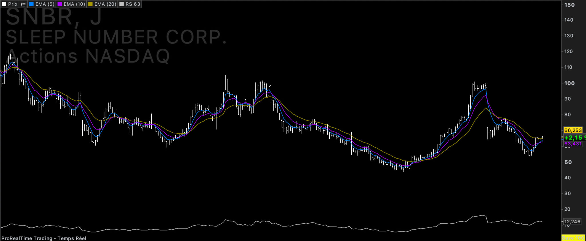 toujours en quête d’améliorer la plateforme prorealtime, pour les trader actions qui ont besoin de certains indicateurs, je cherche à m’inspirer de la plateforme MarketSmith de IBD, et d’intégrer à mon graphique prix un nouveau panneau , réduit à son maximum, me permettant par un jeu de couleur basé sur des conditions d’emplacement du prix par rapport à des moyennes mobiles, du style :