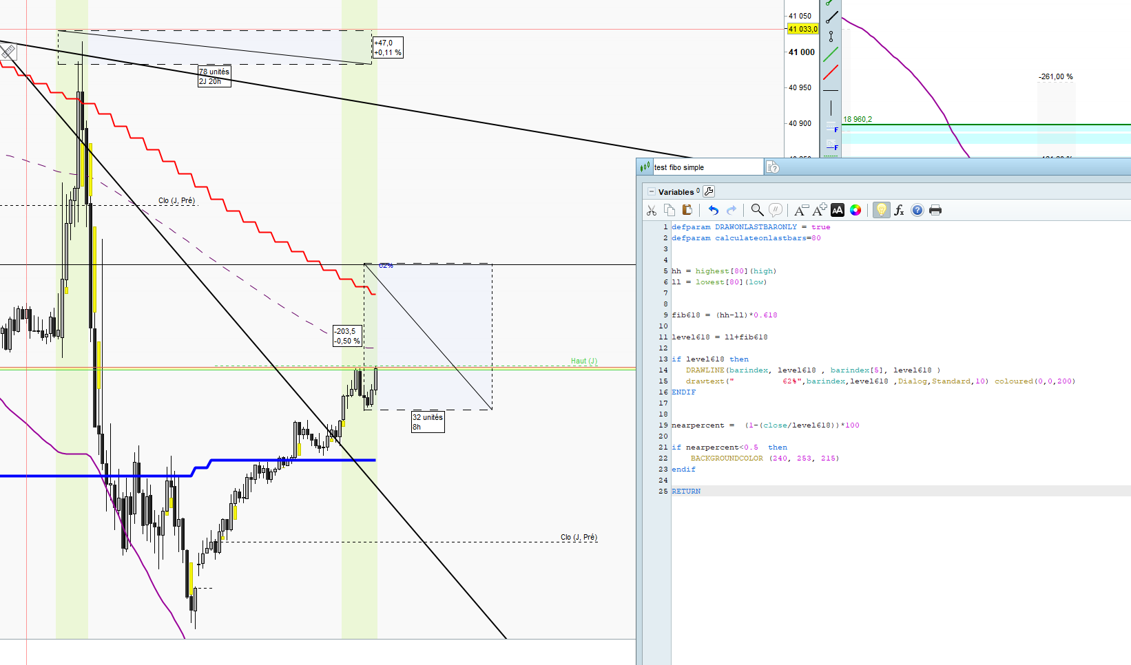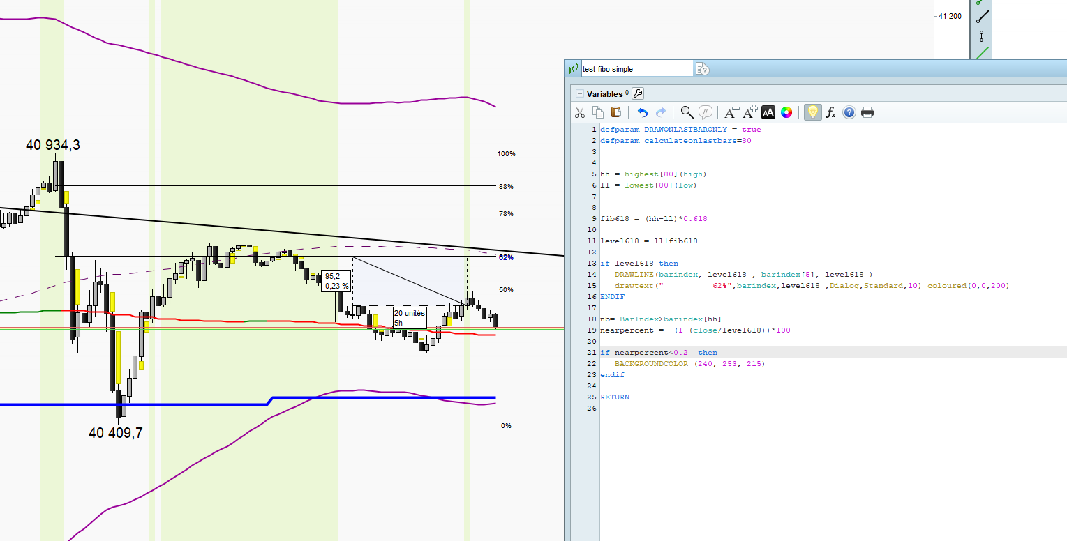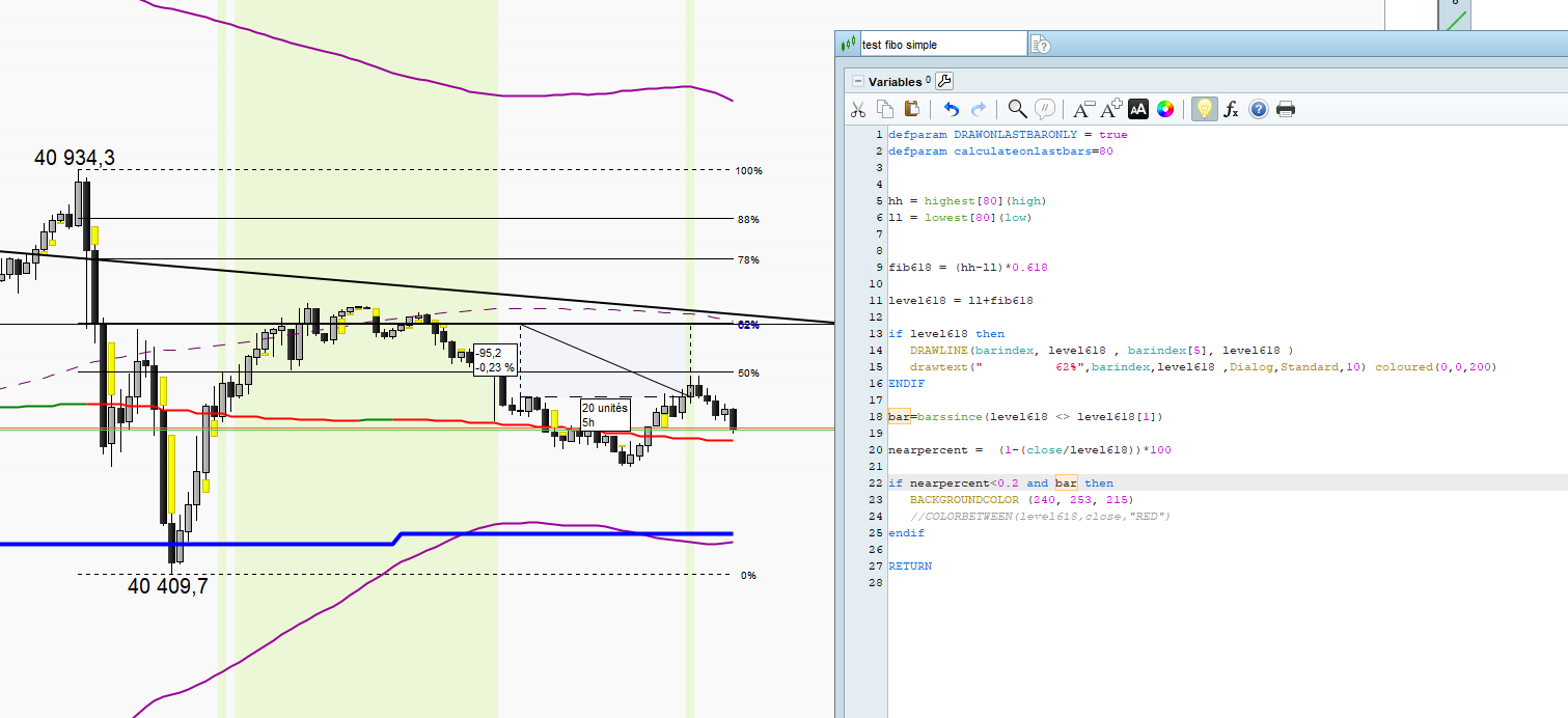 bonjour, j’ai fait ce code qui met un background si le prix approche les de 0,5% du niveau de 61,8 de fibo des 80 bougies precedente, sauf que je n’arrive pas a mettre le background UNIQUIEMENT a partir du hh ou ll detecter , j’ai tous essayé ( boucle, condititon du barindex : barindex> barindex[hh or ll))