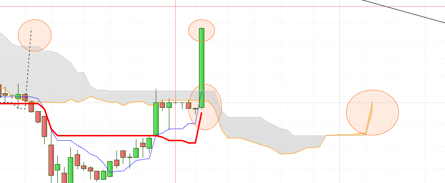 – Dernière clôture au dessus de: Tenkan, Kijun, ssa, ssb (si possible avec cassure du nuage par les prix récemment, ce qui éviterais d’avoir des valeurs déja en très forte tendance haussière)
