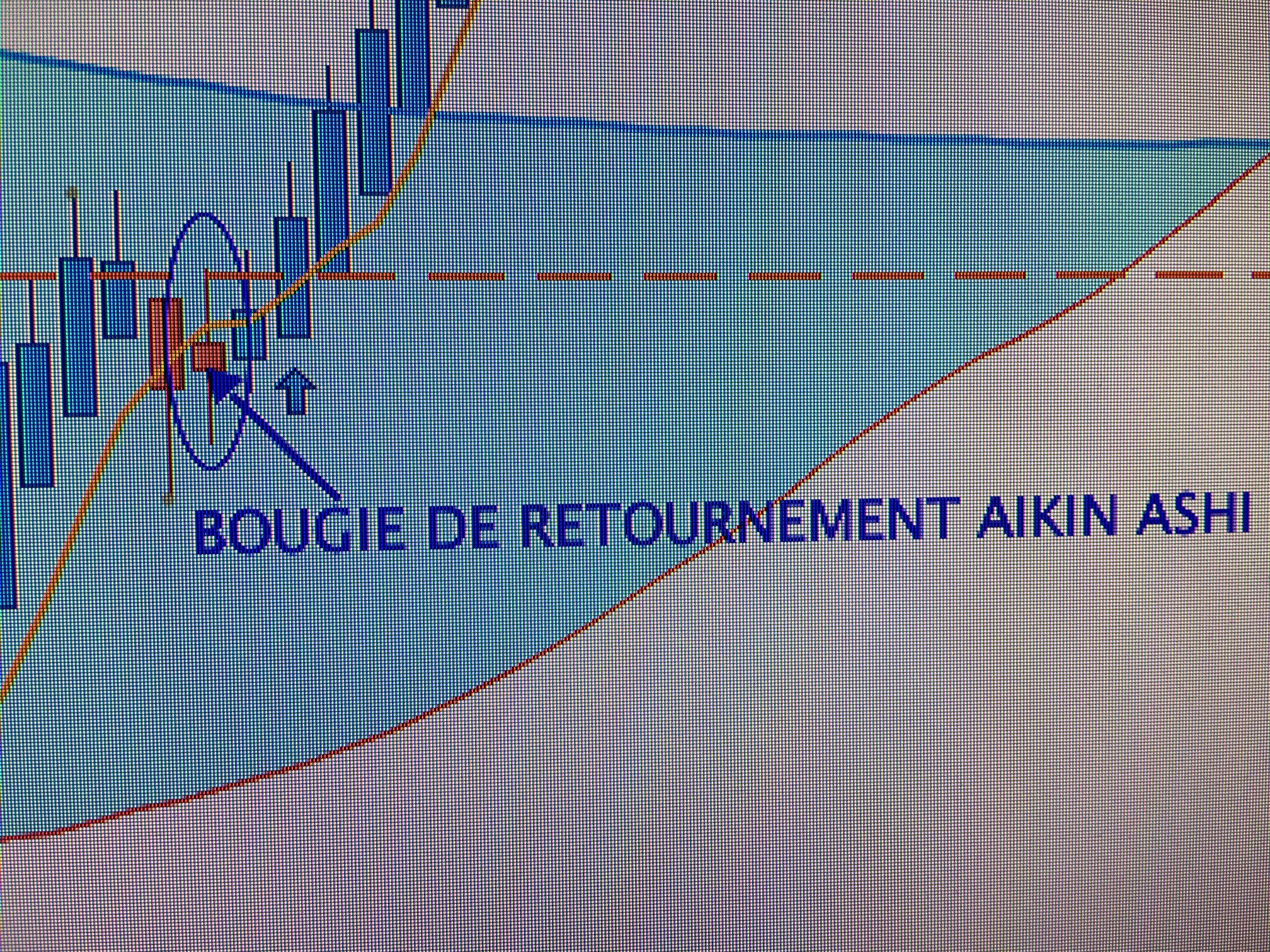 Une bougie de retournement et une bougie de retournement de tendance (Heikin Ashi) = Un renversement de tendance se matérialise par une bougie avec un petit corps et des ombres hautes et basses. (voir photo)