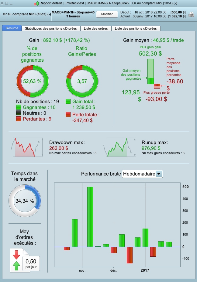 Je viens de mettre au point une petite stratégie simple en combinant l’indicateur MACD et deux Moyennes Mobiles sur l’OR mini tf 3H avec un trailing à 45.