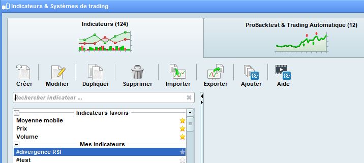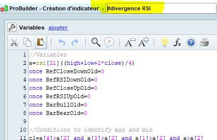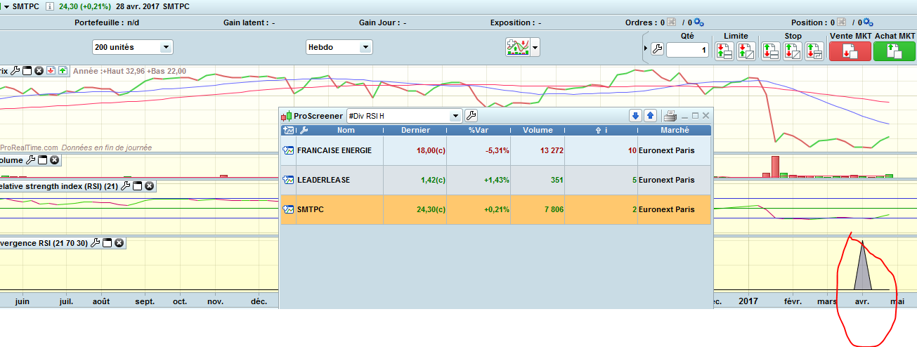 J’ai adapté un ProBuilder “DIVERGENCES RSI” pour pouvoir l’utiliser sur un graphique hebdo et l’exploiter dans un Proscreener afin de détecter les valeurs qui répondent aux critères RSI haussier ou baissier.