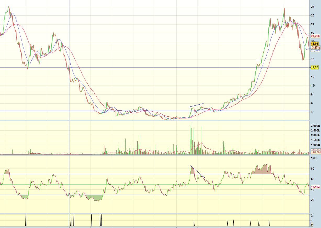 Mais lorsque je veux faire le test du RSI baissier là je ne capte aucune valeur sur France PEA par exemple alors que l’exemple suivant (Crédit Agricole) montre bien l’indicateur baissier (le triangle bas à -1 en bas à droite du screenshot). Pourtant je vais chercher loin dans le passé puisque que je teste jusqu’à i < 200.