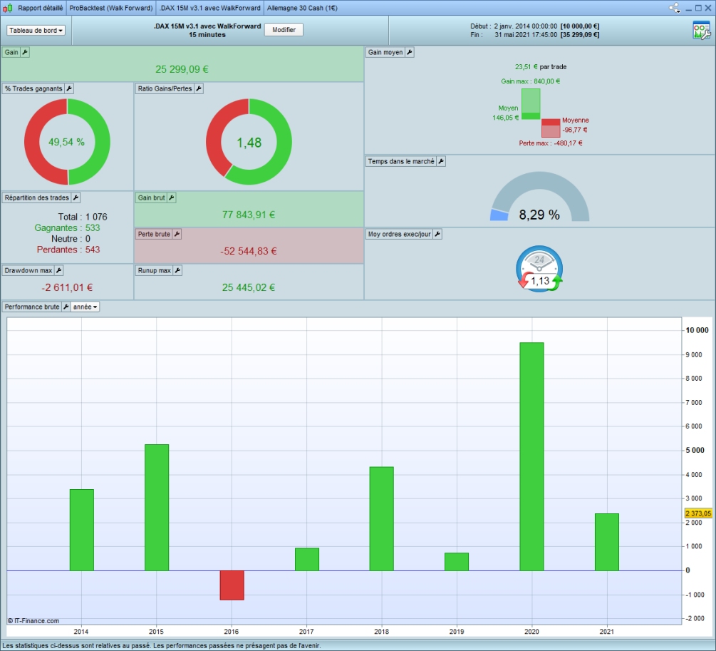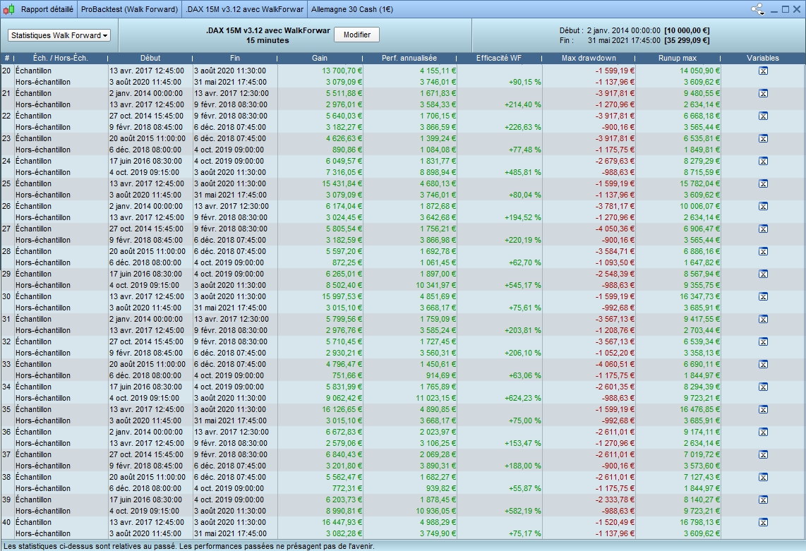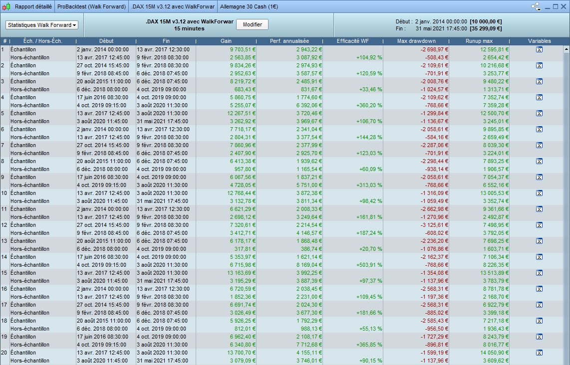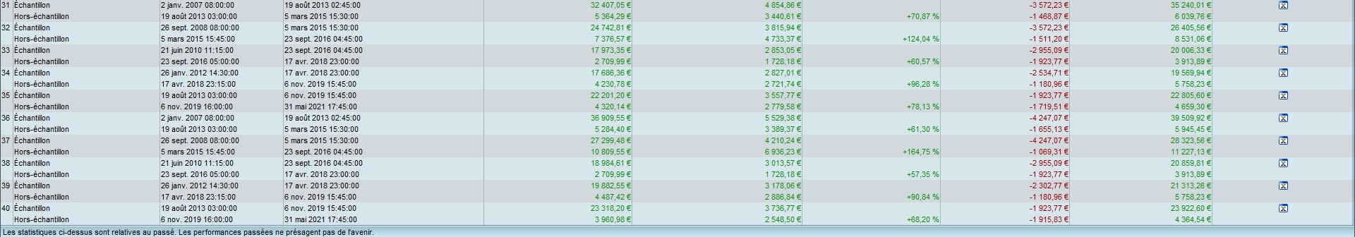 Mais si j’optimise avec la méthode WalkForward (non ancré), la période du 19.8.2013 au 6.11.2019, j’obtiens dans la période du 6.11.2019 au 31.5.2021 (soit une période exactement pareille à celle ci-dessus) un gain de seulement € 3’960.98.