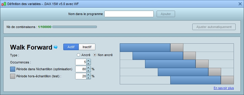 Pourriez-vous publier une capture d’écran des paramètres que vous avez utilisés pour Walk Forward ?