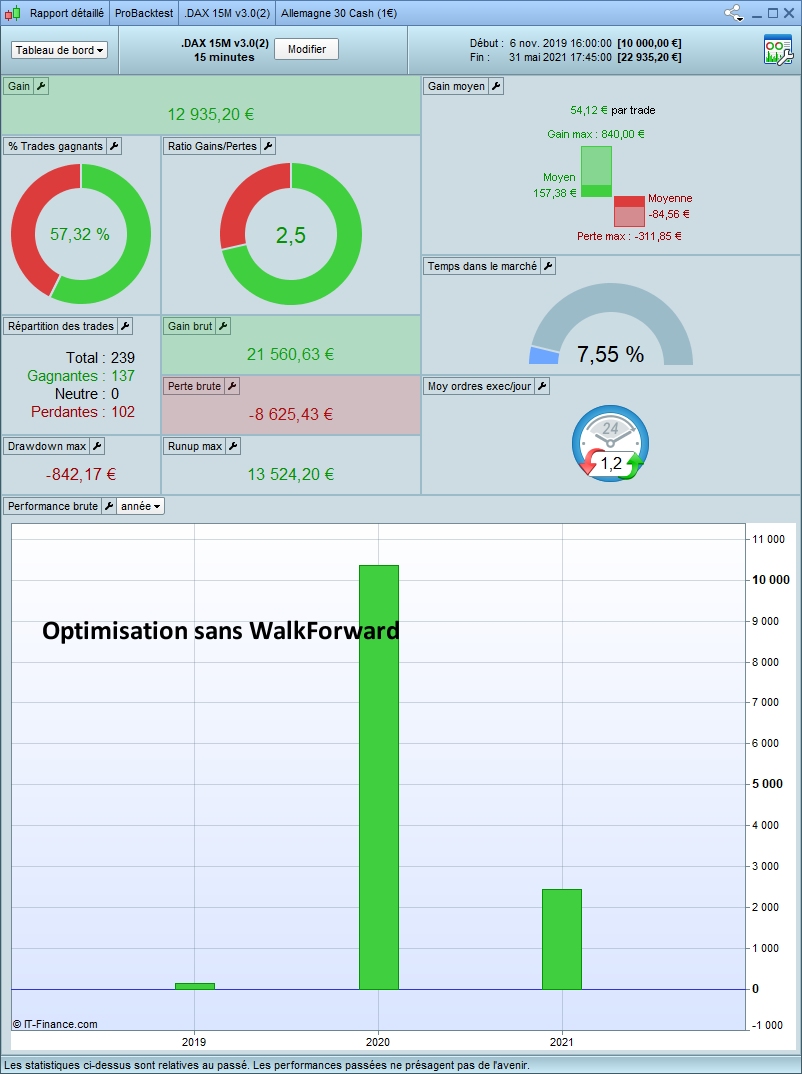 L’optimisation normale qui rapporte un gain de € 12’935.20 ou l’optimisation WalkForward (non ancré) qui rapporte un gain de seulement € 3’960.09 ?