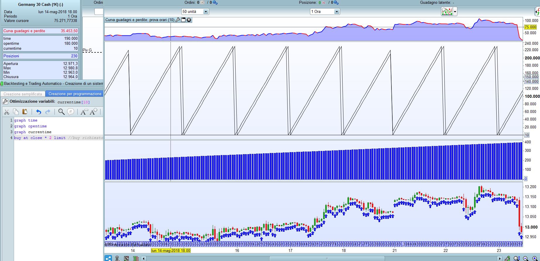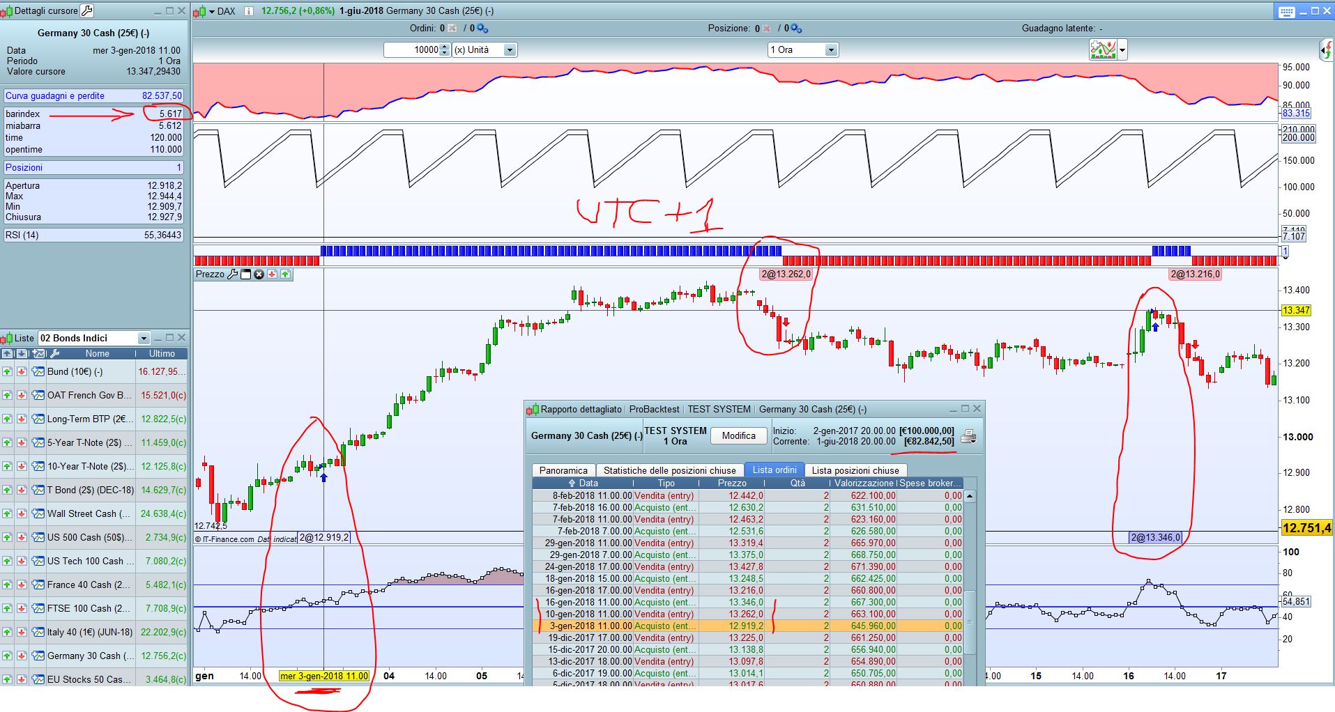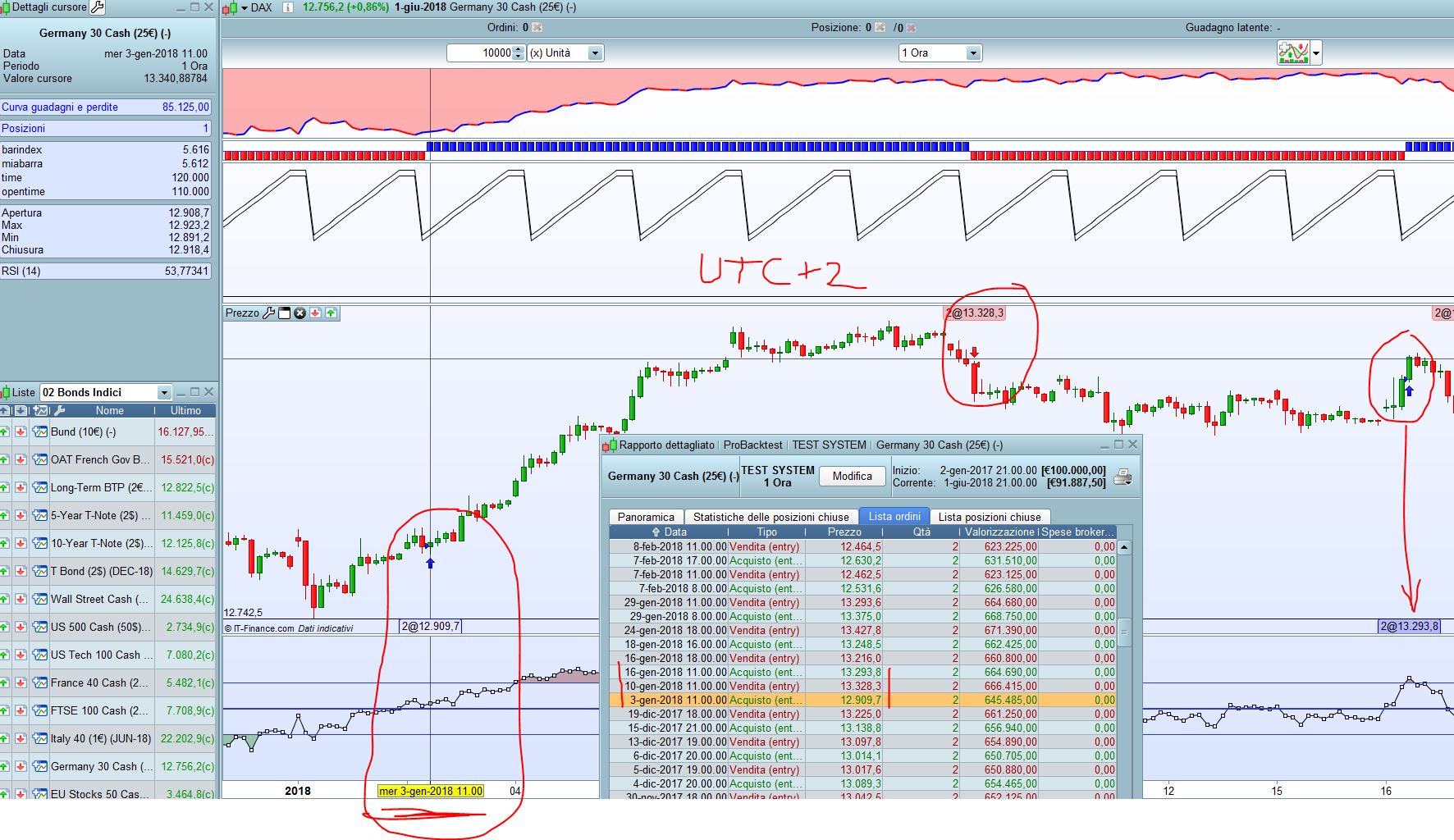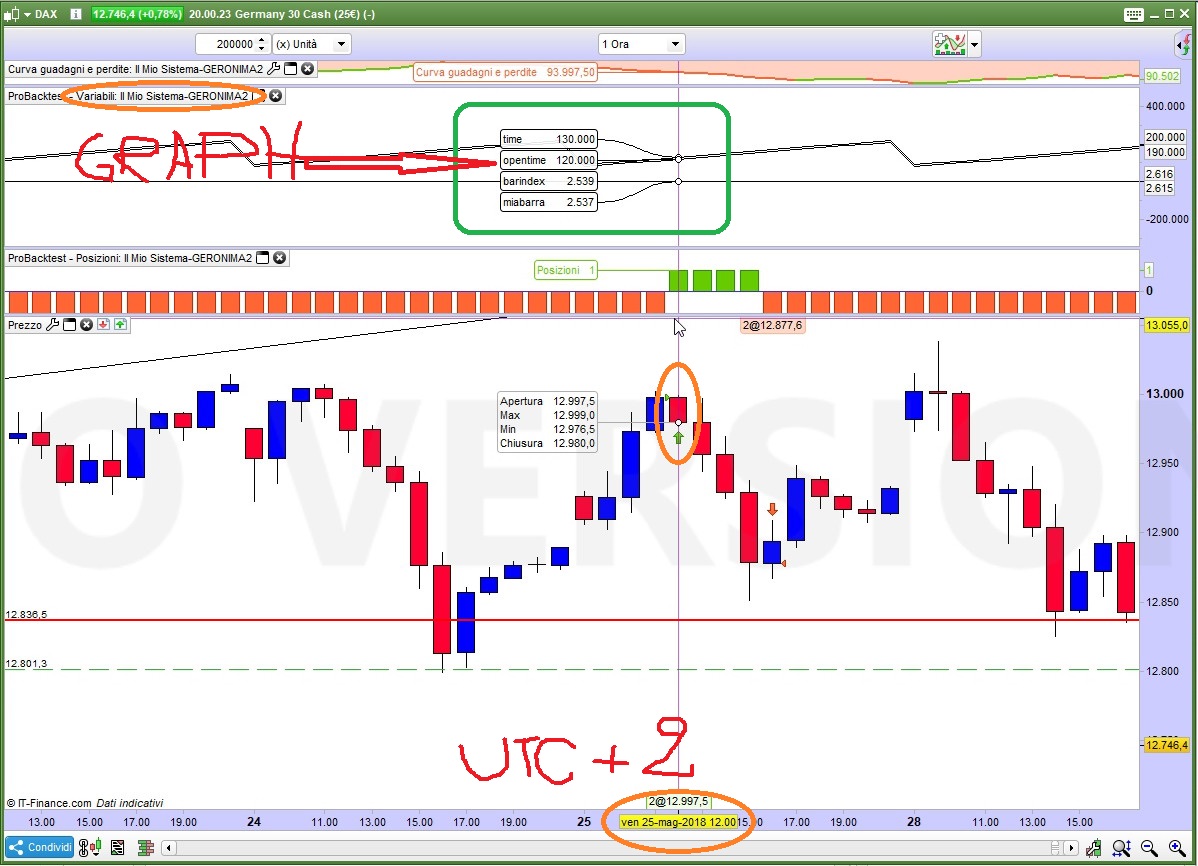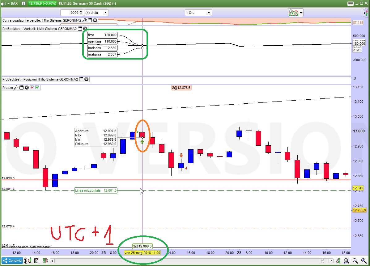 Altro elemento che non mi quadra è guardando l’indicatore sotto lui non va dietro (correttamente) al fuso orario, mentre le barre vengono switchate a destra o sinistra in base al fuso impostato e quindi questo ‘slegamento’ tra l’indicatore che è quello che da il segnale e il grafico è qualcosa che mi lascia perplessa e basita, cioè un cinese che segue questa strategia entrerà X barre dopo rispetto a un americano???!!! questo io continuo a dire che non è corretto! Il corretto secondo me è che la banca dati si deve auto-adattare in base al fuso orario impostato cambiando le etichette degli orari e non spostando le barre come succede a me!