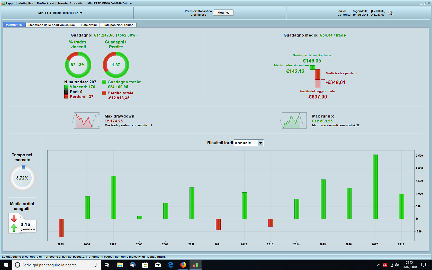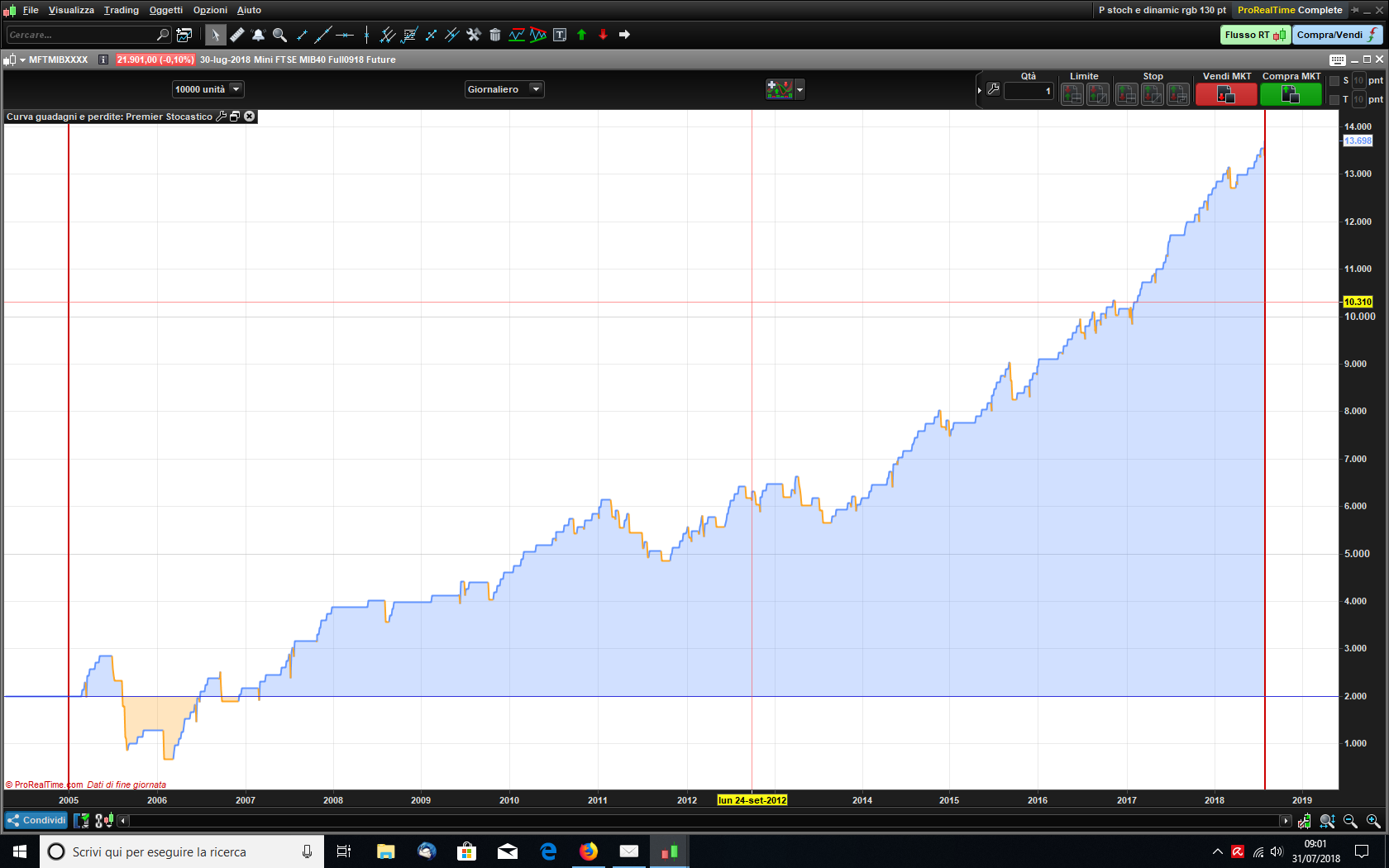 Buongiorno a tutti, ho creato una semplice stategia (con la creazione semplificata) che si basa sull’indicatore “premium stocastic” e sull’ ATR vorrei un suggerimento per inserire/gestire un buon money managmnet. Grazie. Posto il listato (ho fatto copia incolla non so se è corretto) e allego lo screem dei risultati sull’Minifb partendo da € 2000: