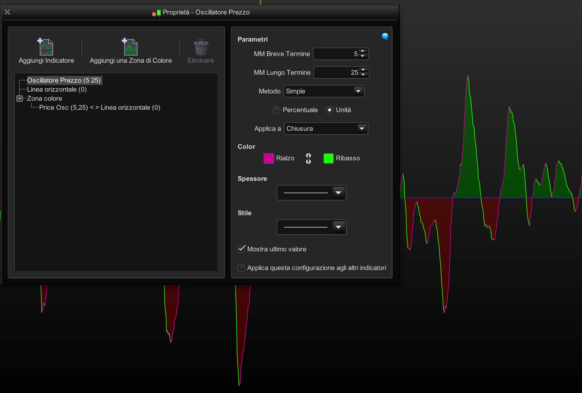 Salve avrei questa esigenza. Ho bisogno che la linea dell’ oscillatore prezzi si colori di rosso quando va sotto lo zero e di verde quando va sopra lo zero. Ho notato che questo e’ possibile con l’ istogramma, ma non con la linea.
