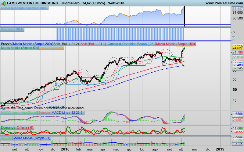 Vengono utilizzate le Bollinger e 3 medie mobili a 50/150/200.