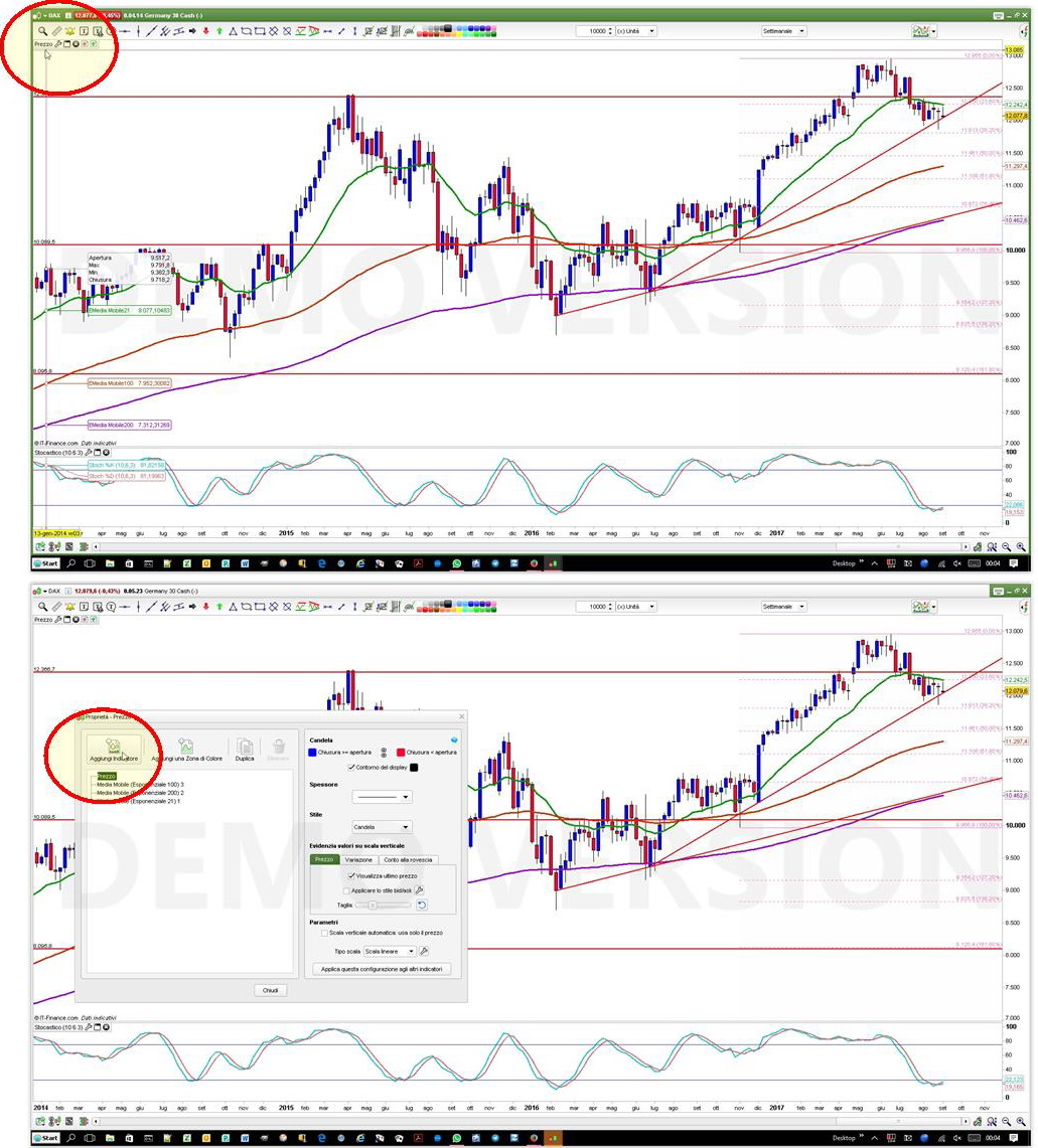 - Nel box che si apre posizionati sulla riga del prezzo e poi clicca in alto a sx. su “aggiungi indicatore”