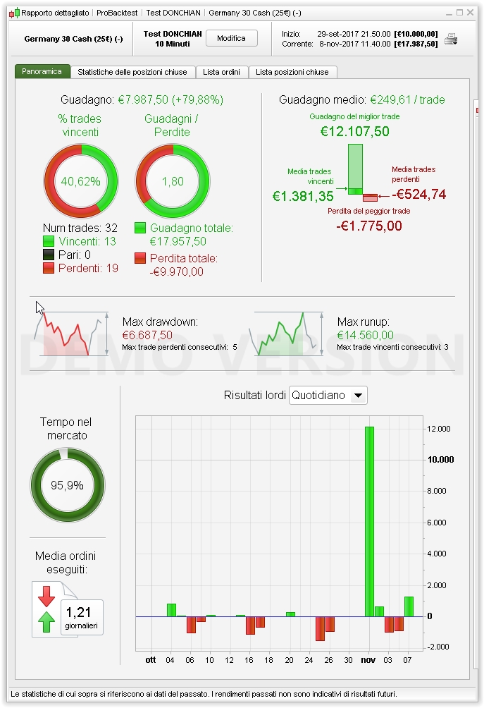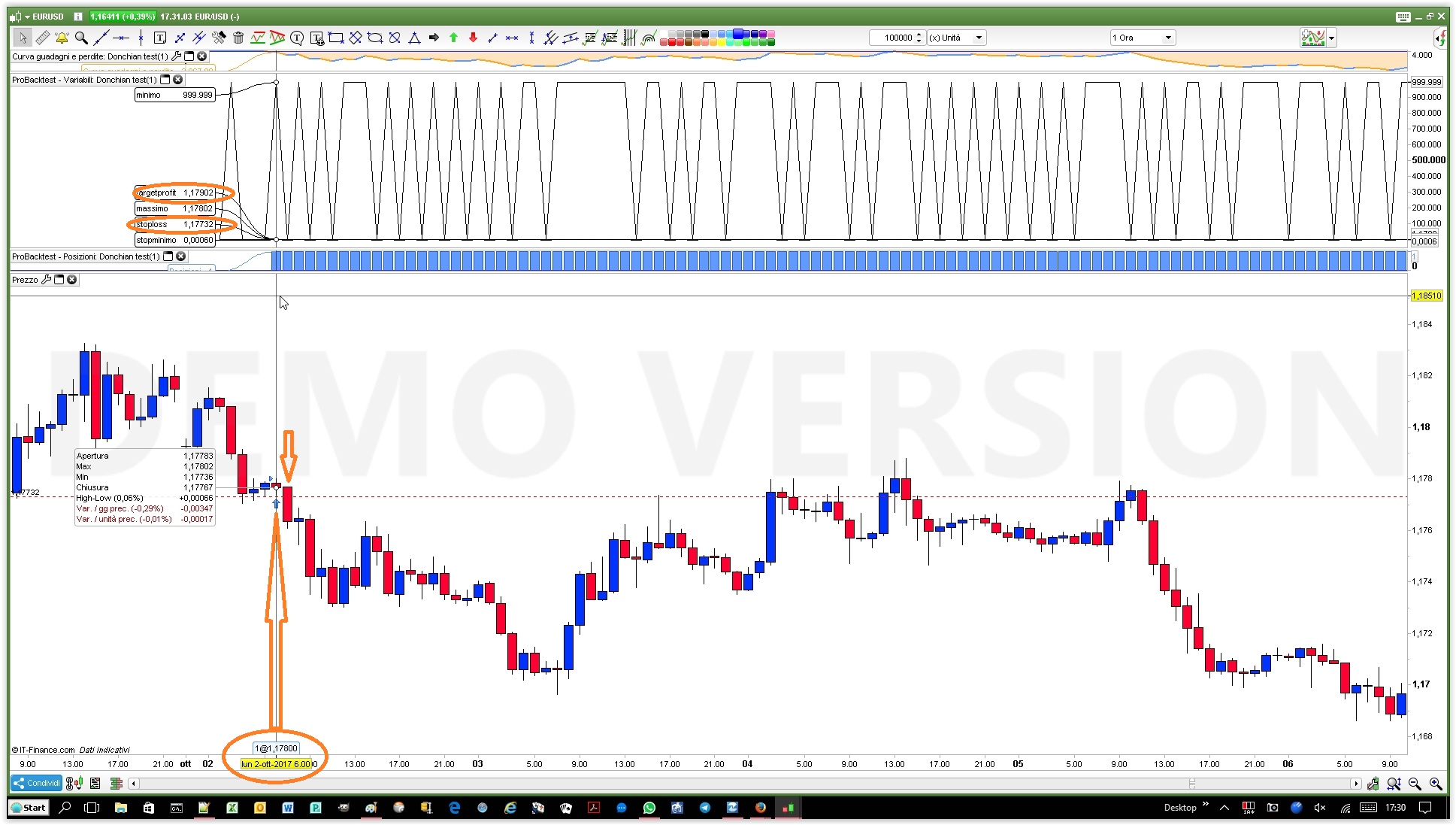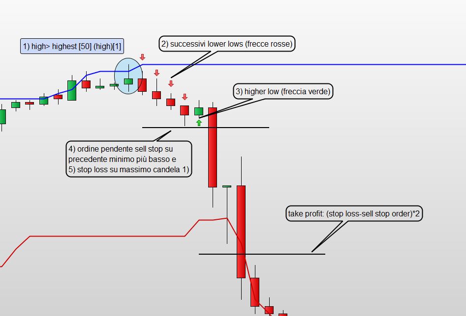 Quindi il sistema considera il minimo precedente perchè è il più basso della serie, e quindi un potenziale supporto e lì imposta l’ordine di entrata pendente in sell stop.