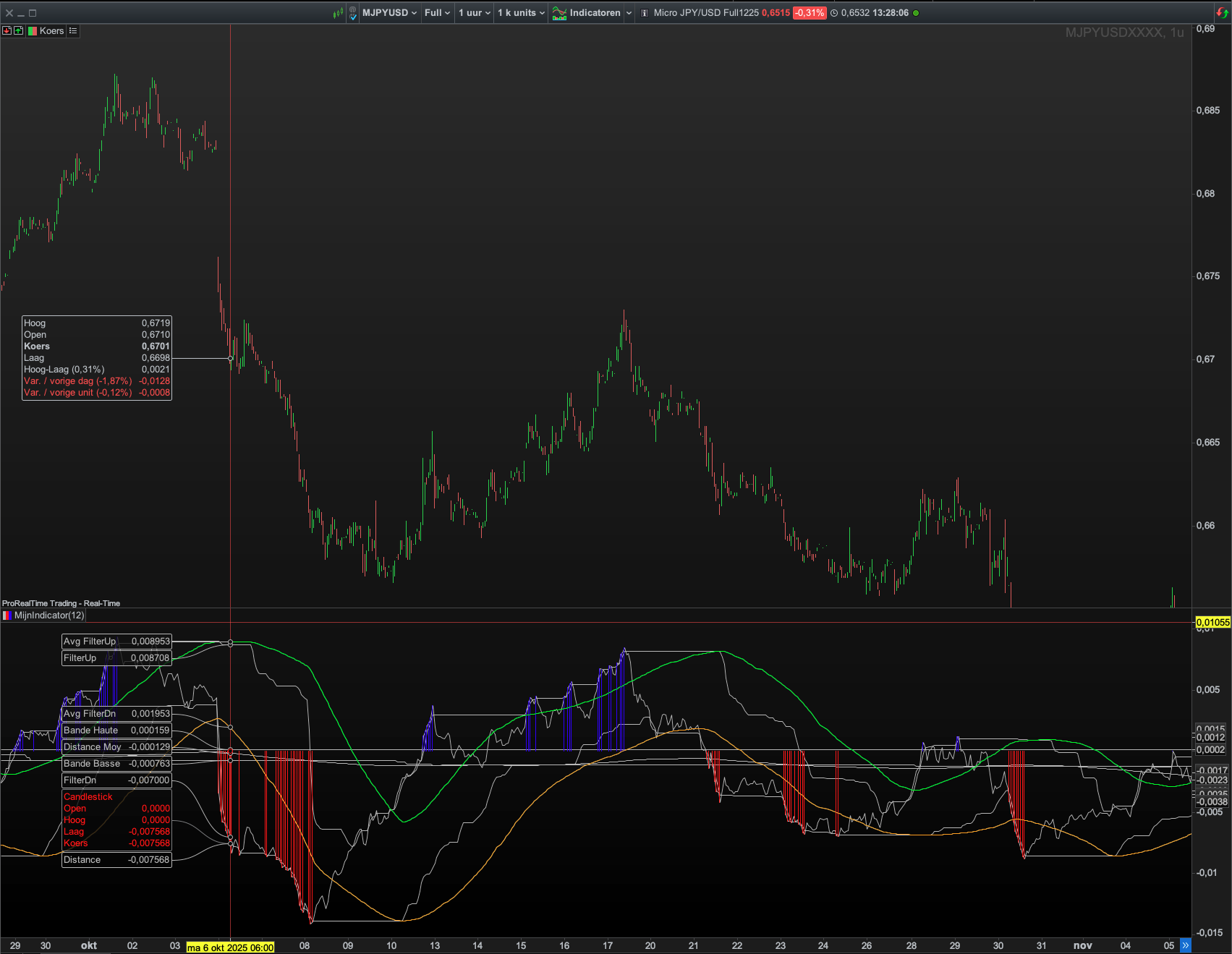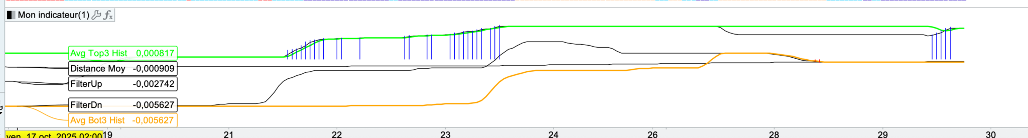 je souhaiterai ajouter à l’indicateur ci-dessous une moyenne des 3 “FilterUp” les plus hauts calculés sur les 50 dernières barres et la moyenne des 3 “FilterDn” les plus bas calculés sur les 50 dernières barres, puis d’en tirer deux lignes horizontales pour matérialiser cette moyenne, cette ligne s’étalant sur les 50 dernières barres.