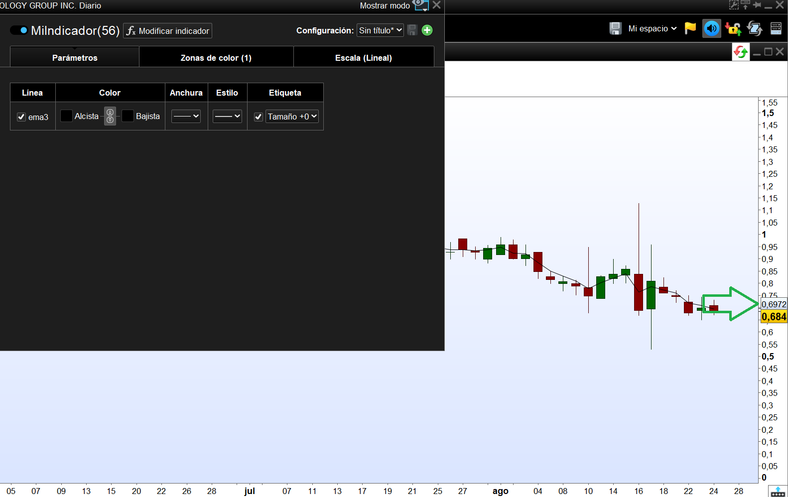 Lo que quiero es poder quitar la linea por ejemplo de este indicador ema3 pero que me deje ver el precio que señalo en la imagen. Un saludo