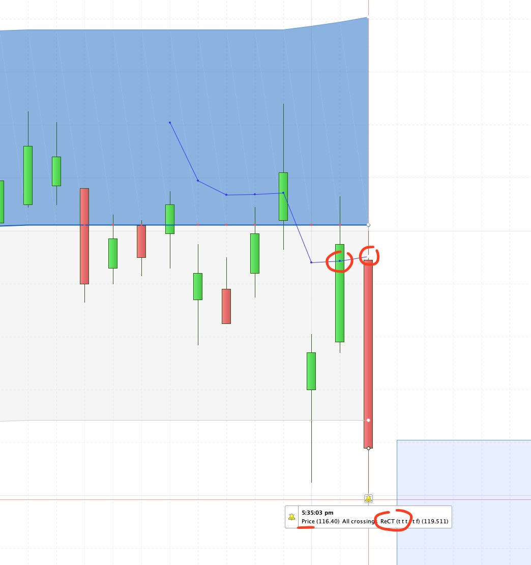 I’m attaching a screenshot where you can see that the price crossed the blue dotted line (called ReCT) yesterday AND today. I don’t get why I haven’t been alerted yesterday