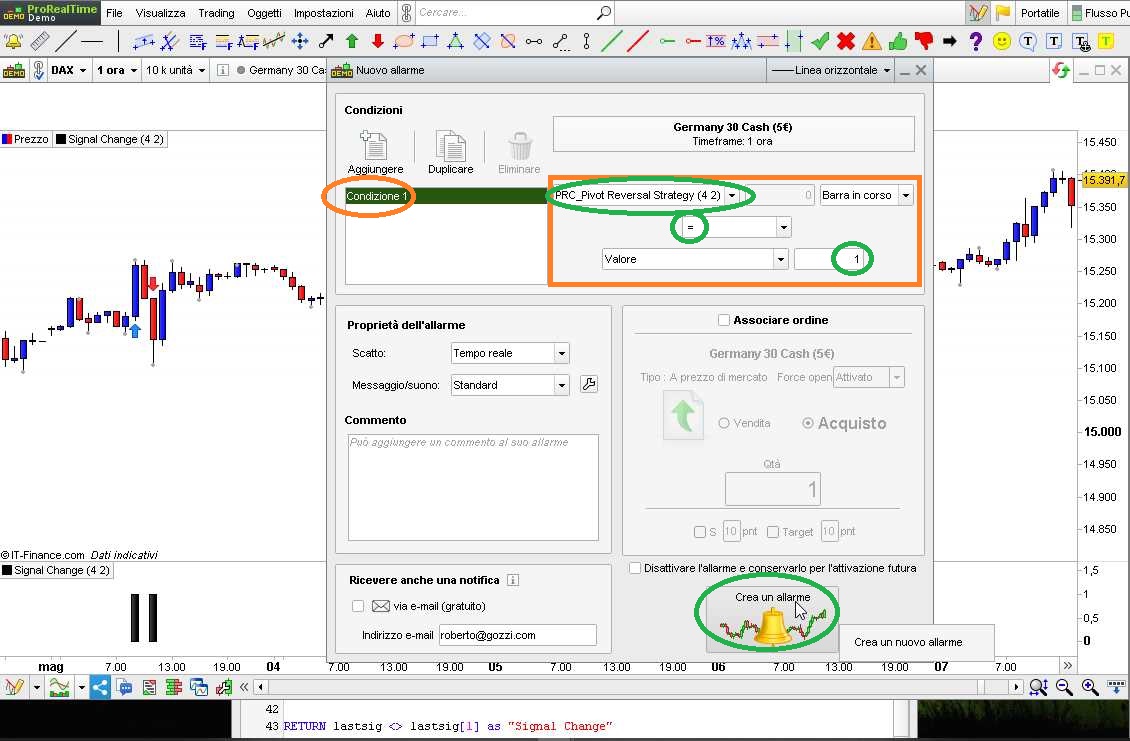 then set an alert with the ALERT tool (bell) on the PRT toolbar (pic X), the set it to activate whenever the RETURNed value is 1 (pic Y).