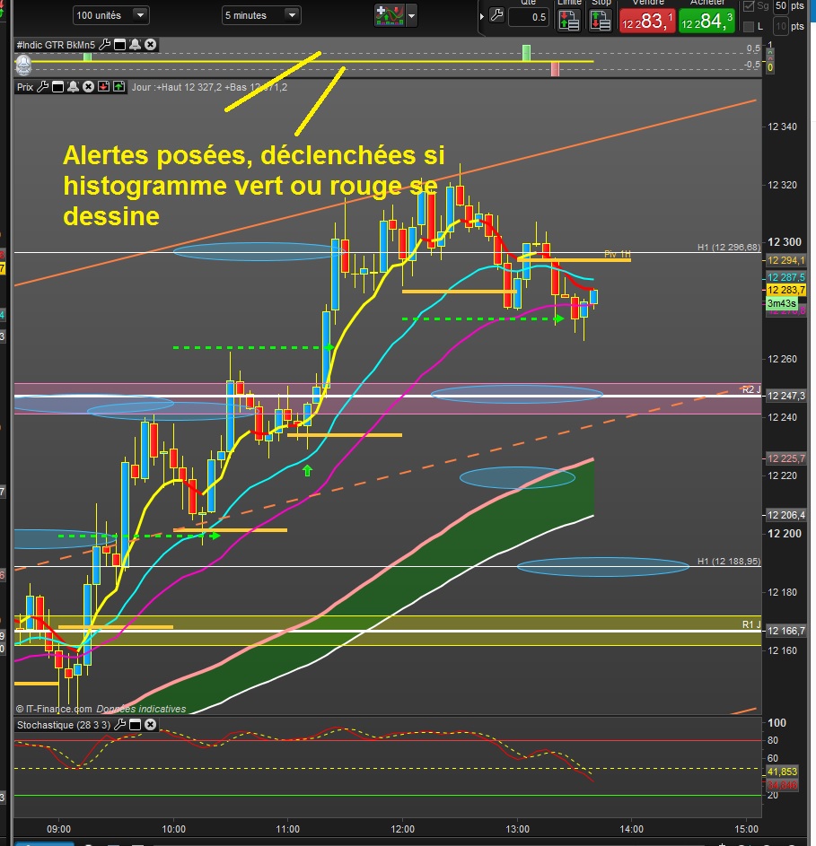 Bonjour Nicolas et merci. Je ne comprends pas ton retour car dans ma compréhension, la seule manière avec PRT d’obtenir une alerte sonore quand un indicateur est déclenché est de faire en sorte que dans le code on fasse apparaitre histogramme dans une fenêtre d’indicateur sous/sur graphique puis de poser manuellement un niveau d’alerte au dessus et en dessous de la ligne “0” (Entre “0” et “+1” pour un histogramme vert, et entre “0” et “-1” pour un histogramme rouge) de sorte à ce que l’alerte soit déclenchée quand l’histogramme vert ou rouge est dessiné. J’ai mal compris ? On peut faire autrement ? Merci . Note : normalement, tout est dans le code attaché et dans la copie d’ecran attachée. Je n’ai rien d’autre à fournir pour une meilleure compréhension de la problématique rencontrée. Un point nouveau je vien d’avoir une alerte visuel ET sonore sur un histogramme vert > j’ai supprimé l’alerte mais quand un histogramme rouge s’est déclenché 2 barres plus loin, l’alerte ne s’est pas déclenché. C’est à n’y rien comprendre (pour moi)