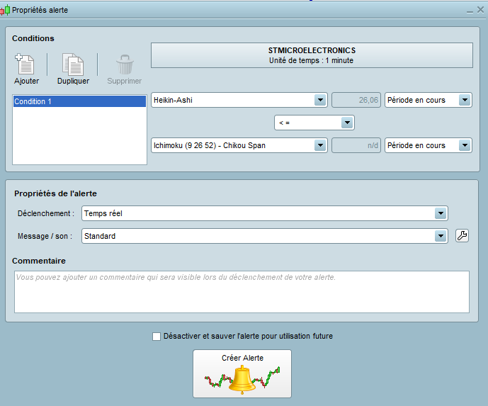 Dans l’outil des alertes, il faut sélectionner le prix actuel (Close = Chikou) et vérifier un croisement haussier avec le prix (Close) mais 26 périodes en arrière.