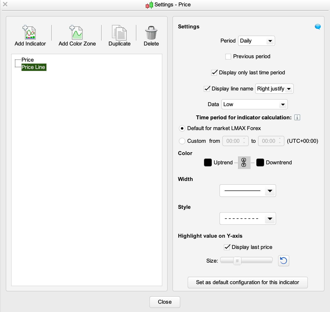 • “Ajouter un indicateur” -> “Price Line” -> définir la période comme “Daily” et les données comme “Low”