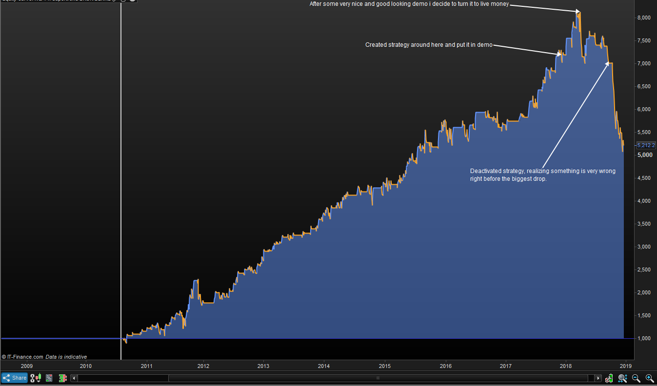 I also want to point out a very important point: Another obvious point to why this algo stopped in my opinion is curvefitting. This was created before i developed my process for designing new algos in the hopes of minimizing the risk of overfitting strategies, which i have described in another post. This is potentially overfit and the huge recent drop would certainly speak towards that. Who knows how this equity curve looks in 10 years time lol. Might do fantastic as soon as things settle down, might continue down to 0. Im not gonna stick around with real money to see hehe.