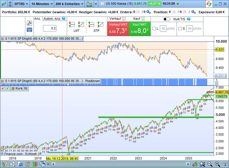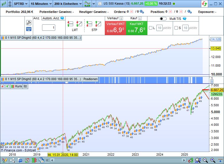 The thing with the IG FX conversion level just gave me pause… so I quickly tried it again. Here’s the SP500 M15 with the same algo, which locates highs and lows on an intraday basis and works with them. The €1 chart doesn’t work at all. The $1 chart looks exactly like what I’ve created. But the difference is stark, isn’t it? Like I said, the same algo!!!