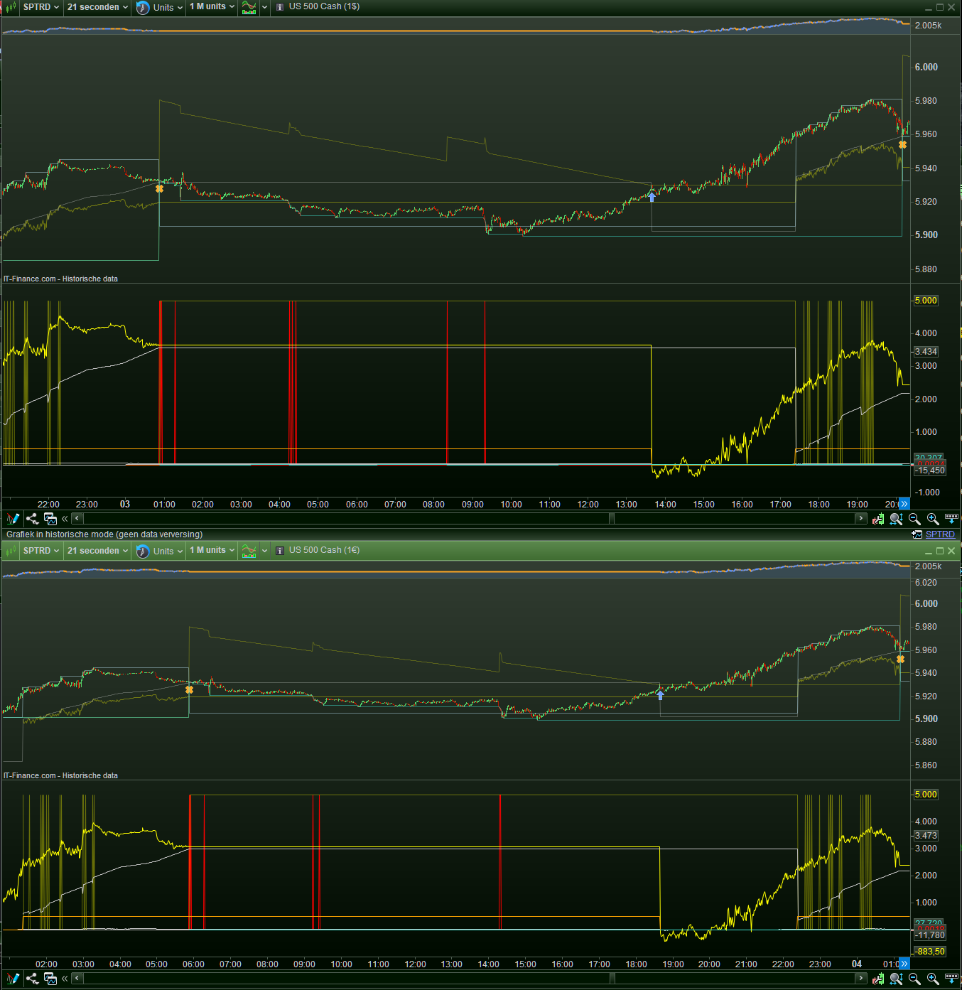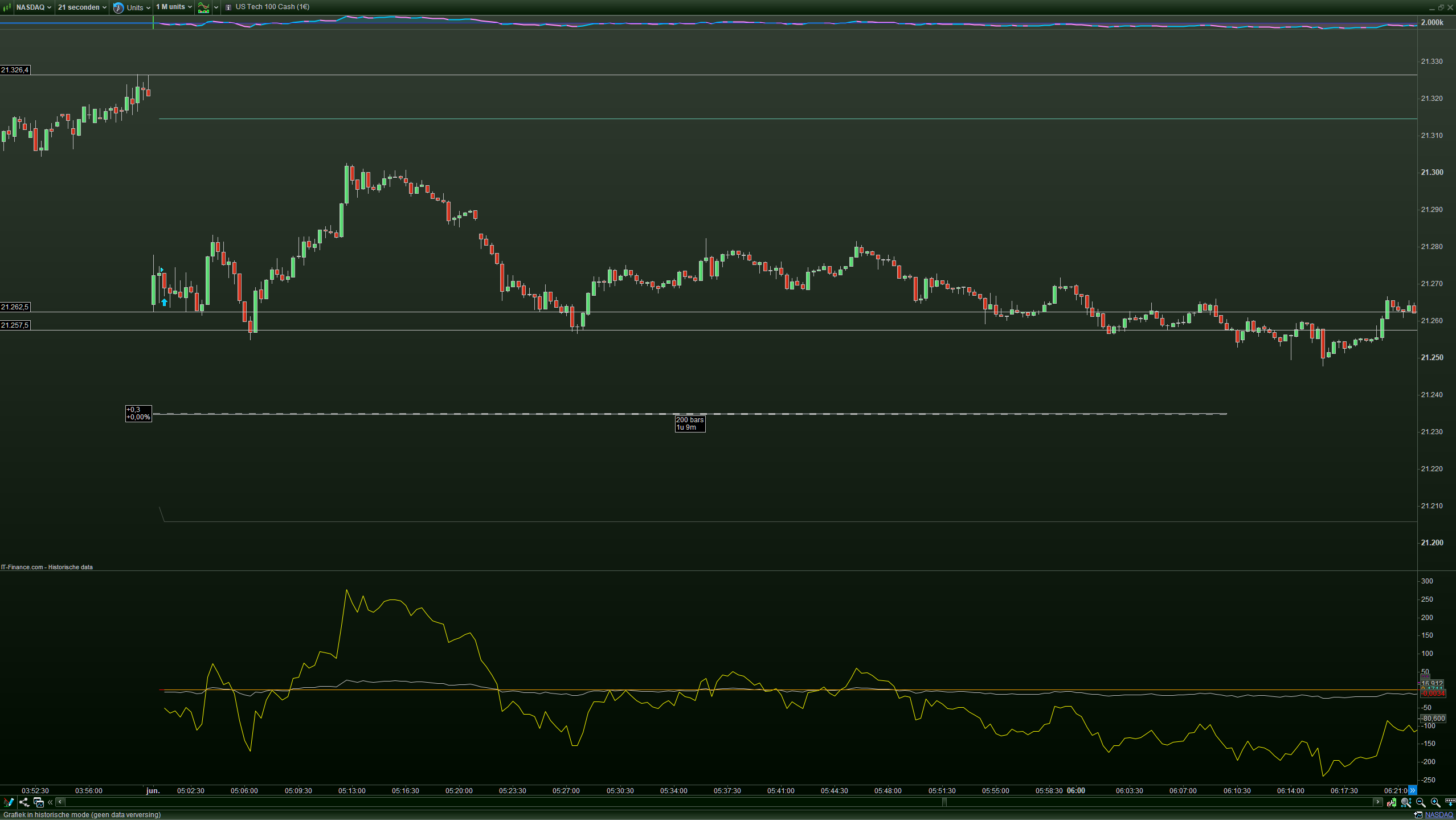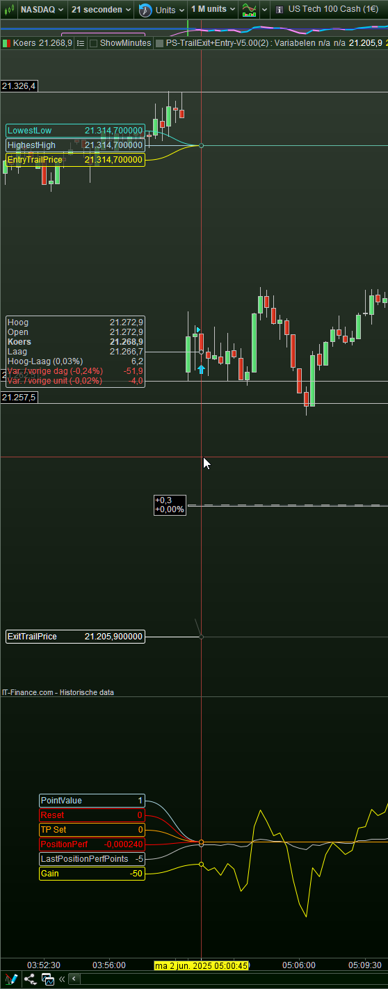 I like to notice that at exchanges data for “seconds” streams is always different than for minutes and beyond. How this is at IG’s I don’t know. Anyway I am using seconds here (because 21), and my comparison could work out very different for minutes based charts. I mean, something is the most clearly wrong and where this is I can’t tell. Also, in the post I referred to I reasoned that the $ chart should be the correct one, while in this US Tech 100 case I reason it the other way around : the € data is the correct version because my backtest starts at 05:00 on June 2 which is in this case in order/correct for the € chart – see the 3rd attachment) – this system just dives in after 2x 21 seconds, so this should be about correct.