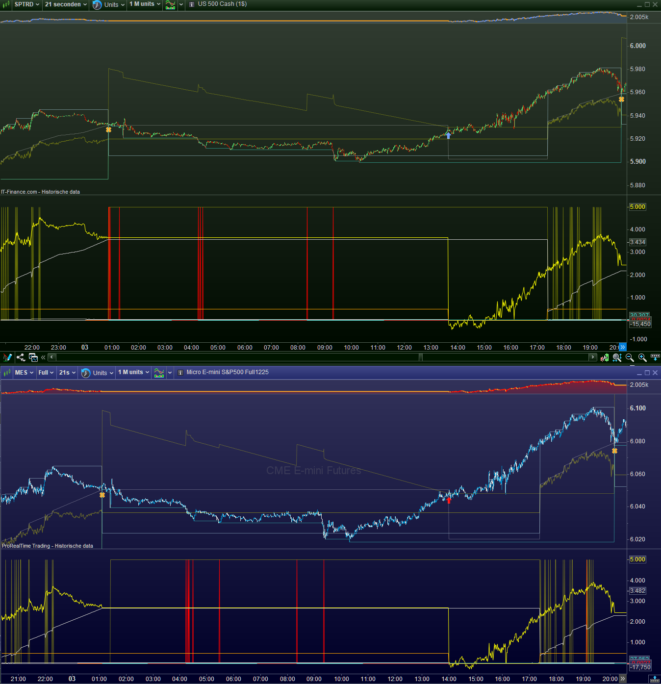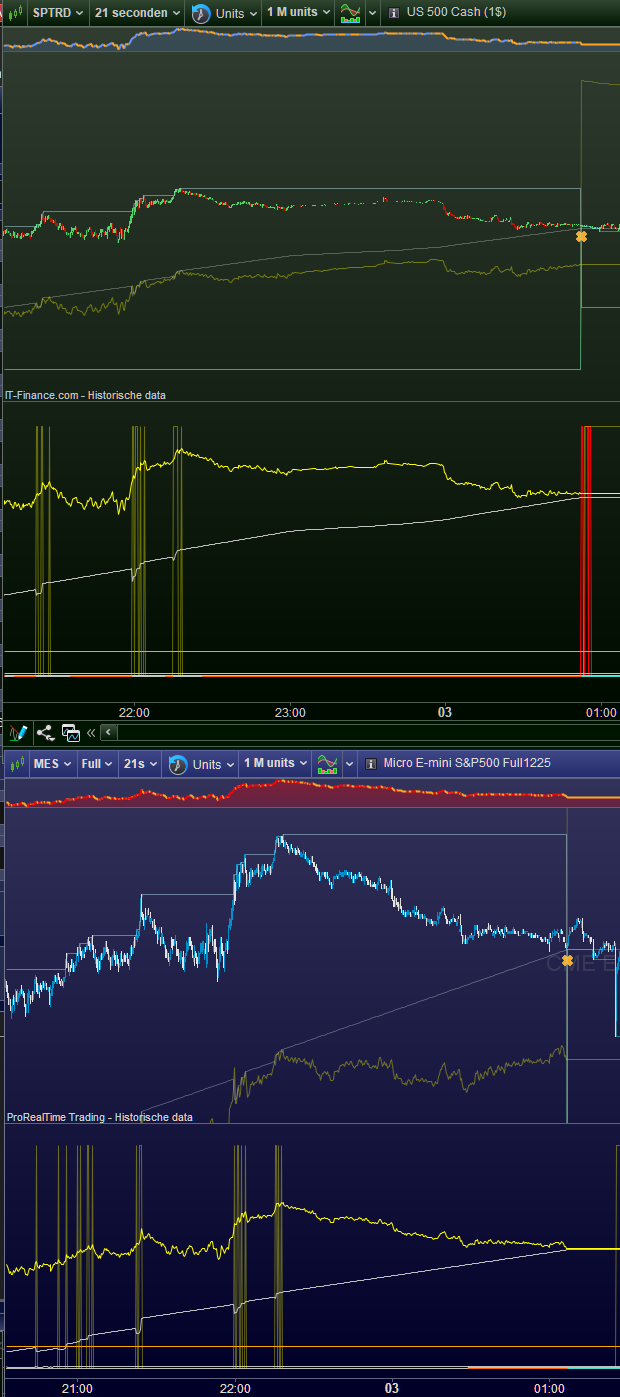 Anyway I can’t tell any more which of the two is correct, if any. I also can’t tell how this develops in real time. I mean, do we see the same differences when we observe real time price development ? Is the (backwards) backtest we will apply tomorrow representative for the data we see today in real time ? In the time span of about 1 hour and 15 minutes there’s a difference of 4 points between the two charts ??