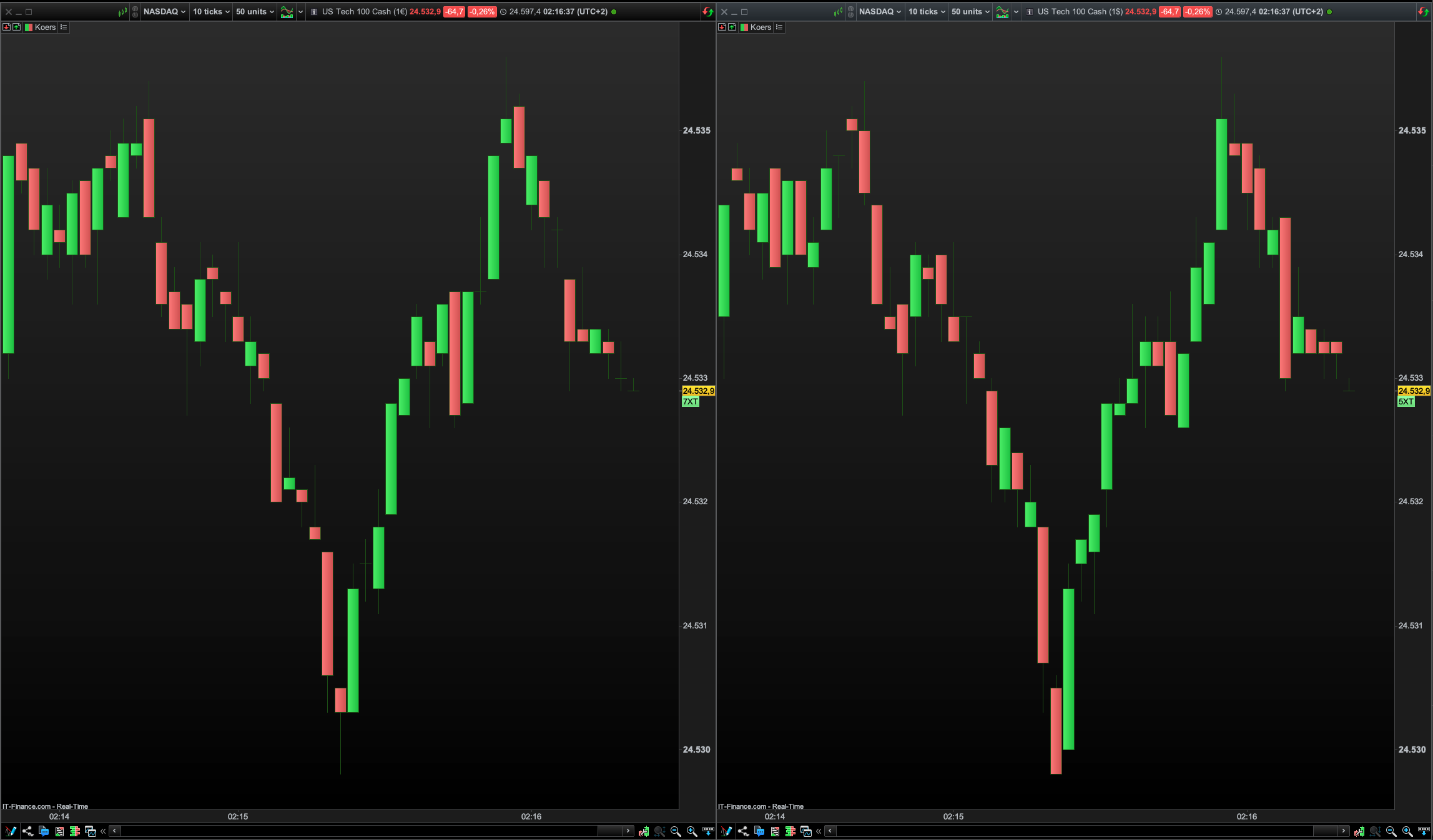I have checked $ against € for US 500 and US Tech 100 on seconds charts and minute charts, and both currencies are exactly the same now ! 🙂