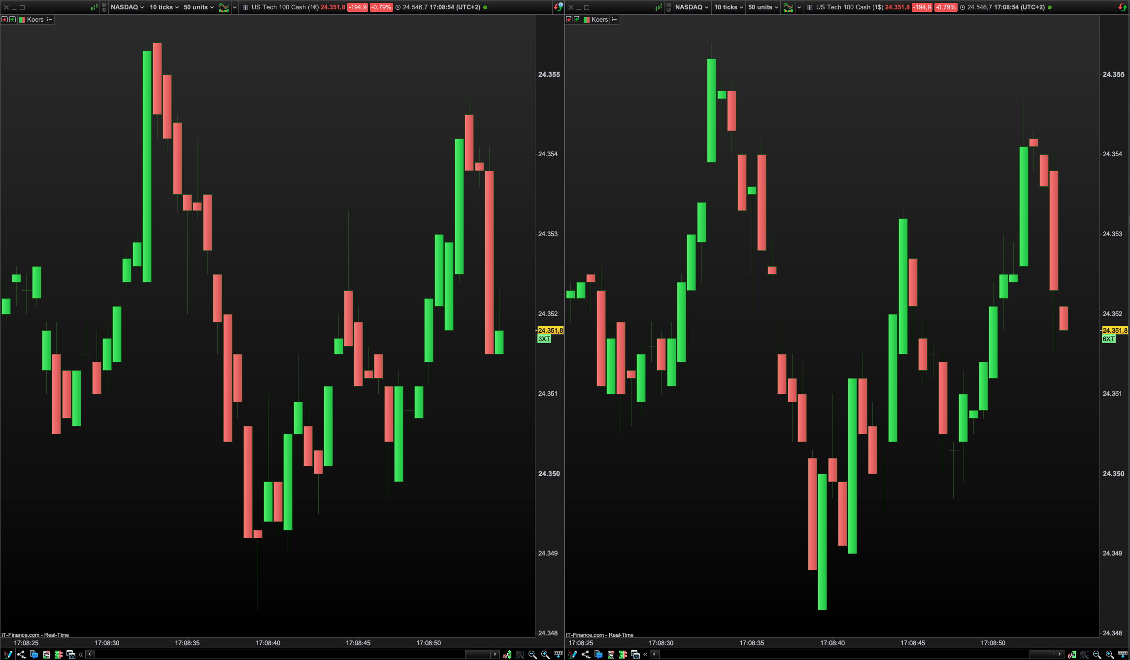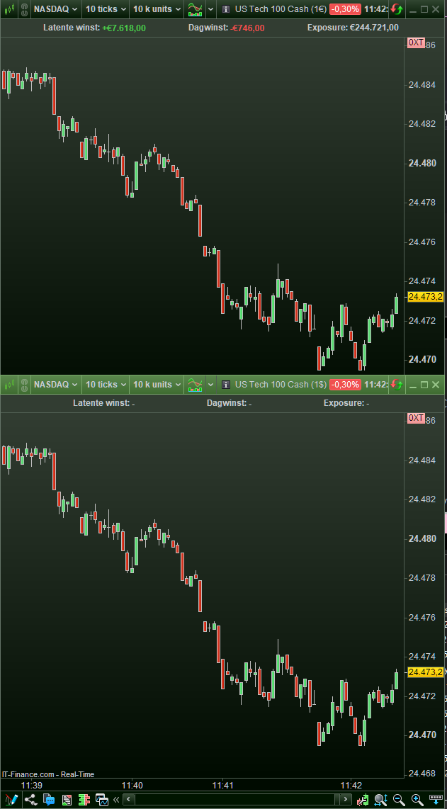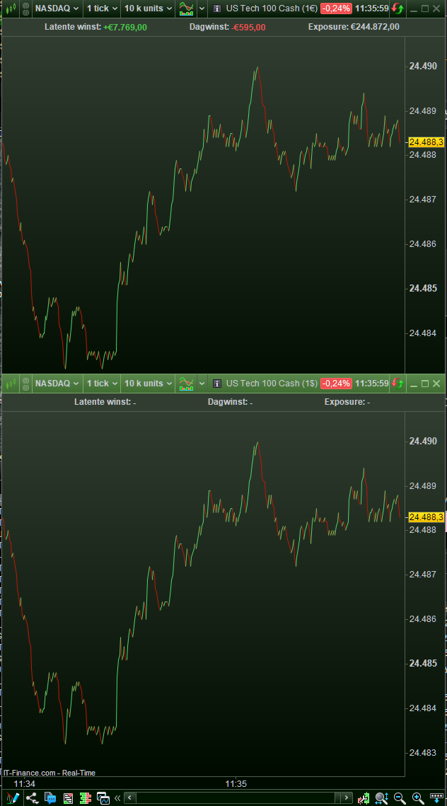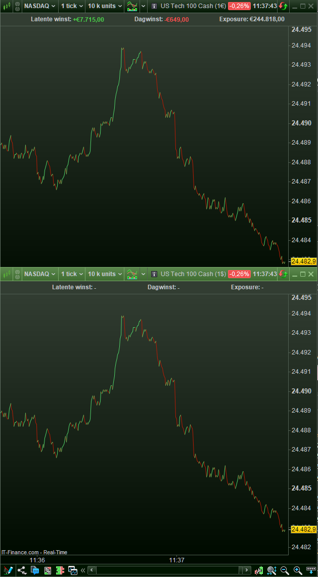 The current tick charts of the US Tech 100 in euros and in dollars…