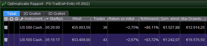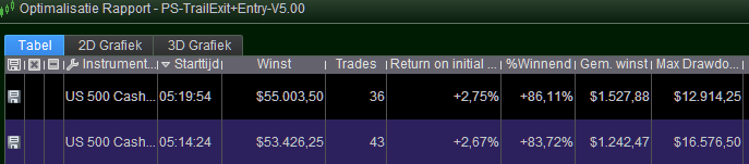 Below you see side by side the result in $ (left) and the result in € (right). Mind the currency indicator in the “Gem. winst” and “Max Drawdown” columns.