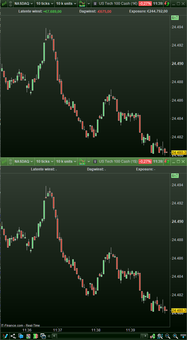 All figures are exactly the same (since this morning), which is exactly how it should work. And of course, using the $ contract brings less than the € contract, just because the value in EUR is higher than in USD – with the same numbers that is (like the shown 55.003,50). Also : the investment in $ is lower thus the profit (or loss) in $ is also lower (with a EUR/USD rate of 1.174 today).