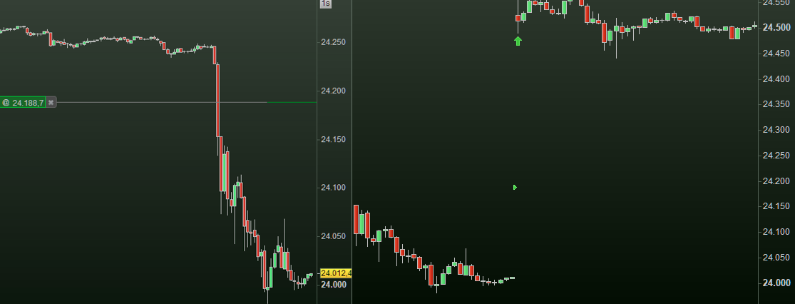 Also notice that the Entry was there the second bar (thus see 4th picture in the right) and thus during the first bar totally nothing happened – however the bar was there. Thus, no prices frozen (which, again, I also did not notice during that period of time), but instead the typical behavior of IG turning manual (which they do at high volatility).