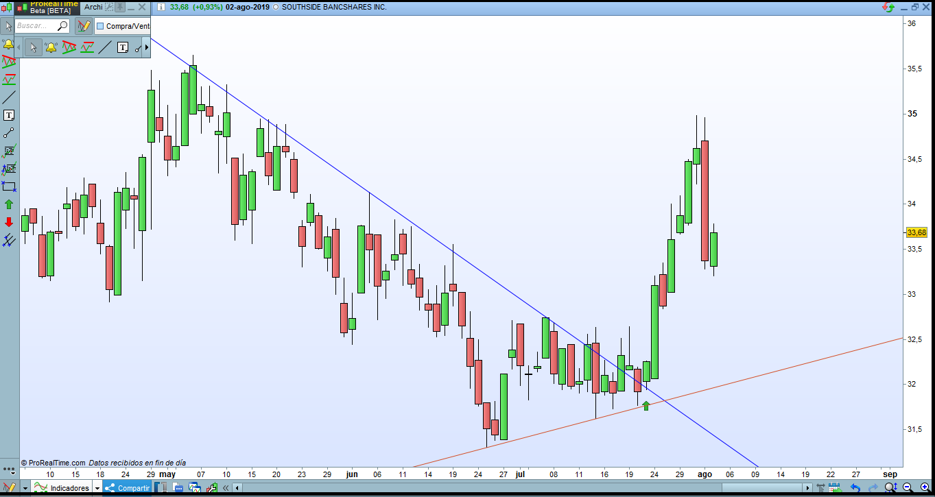 Necesito ayuda en las líneas 35 y 36 para añadir una flecha hacia arriba cuando el precio cruce la línea de color azul como adjunto en la imagen anterior…….