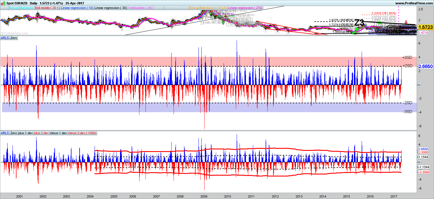 In order to make the indicator more useful, we apply +/- 2 & +/- 3 standard deviation lines on the ARLS oscillator. We deliberately do not plot a +/-1 standard deviation as this captures 68% of oscillation and it is the extreme moves (i.e. 2 & 3 standard deviations) that we want to identify for trading set ups.