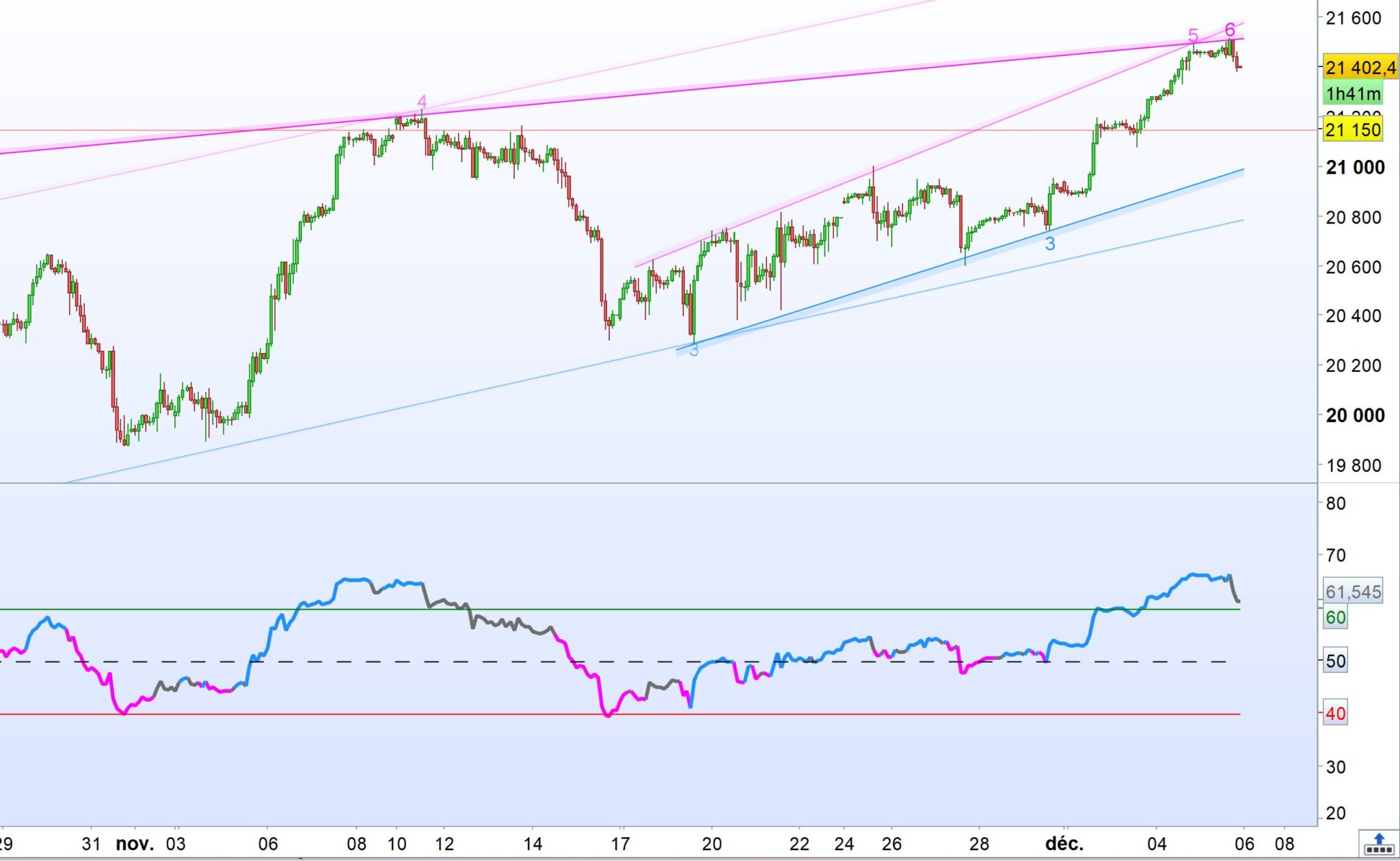 // line changes color with diagonal breaks. Additional support/resistance is shown by 66.67 and 33.33 lines.