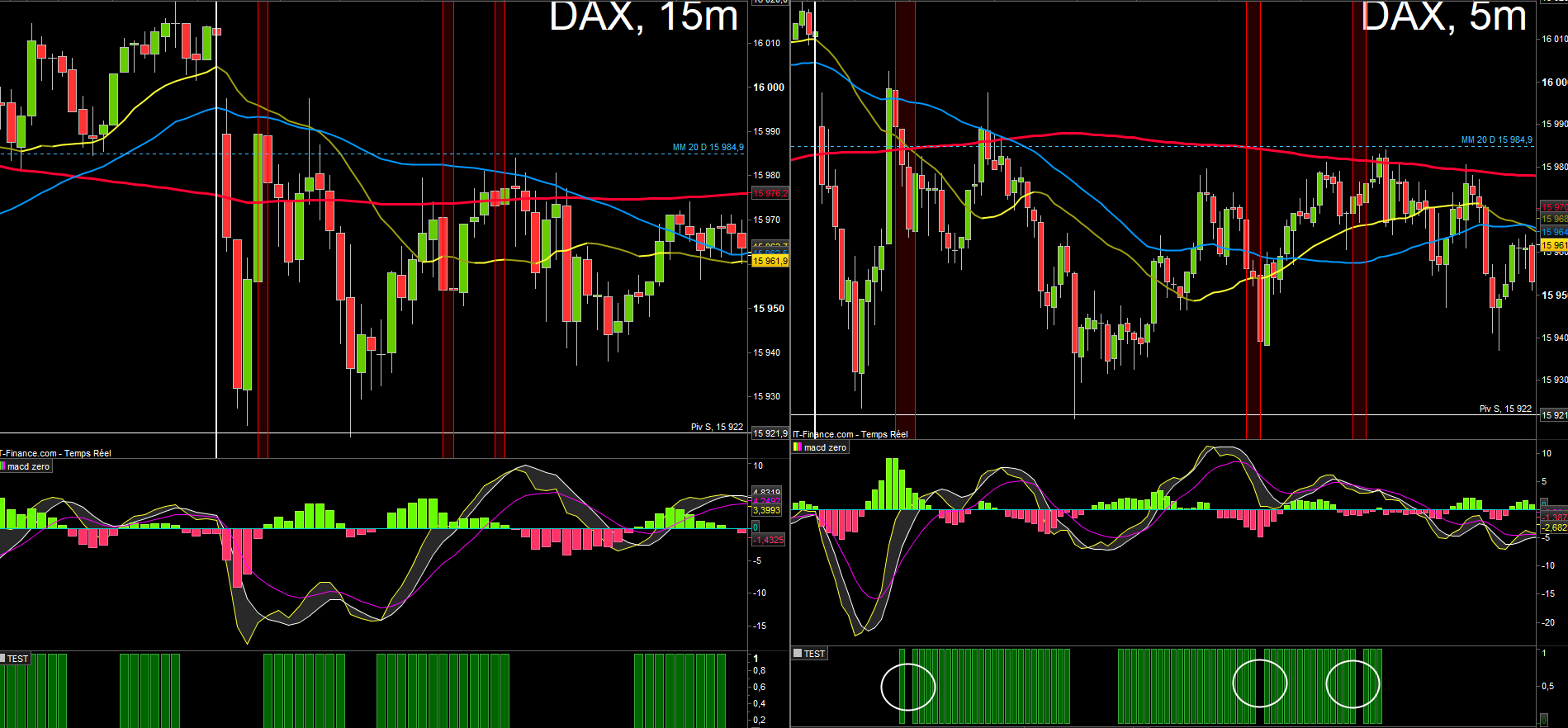 Je cherche simplement a indiquer sur le Timeframe 5 minutes lorsque le MACDzéro passe au vert en 15 minutes. Mais lorsque je l’exécute en 5 minute, cela me laisse des trous.