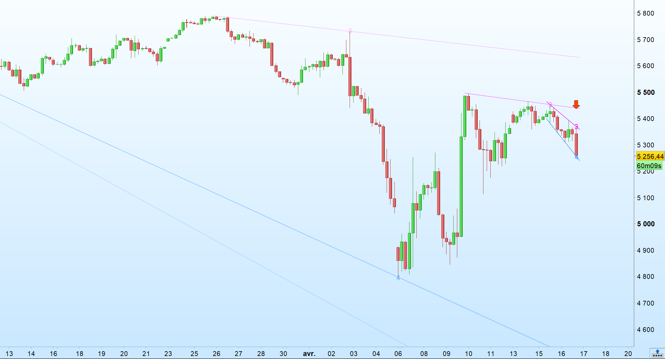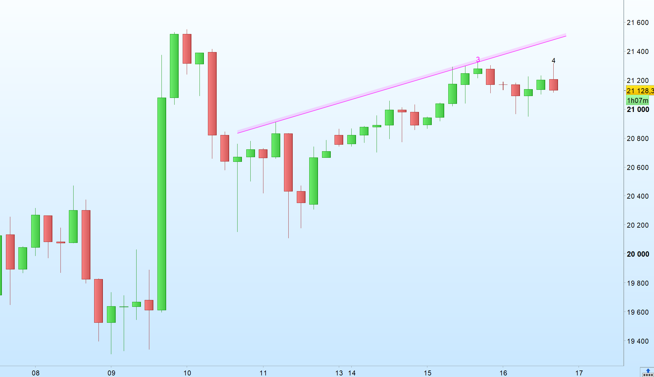 DAX 4h time frame. The 4h candle is red with the bull trap above. Indices may fall like a stone now… (if crystal ball is right).