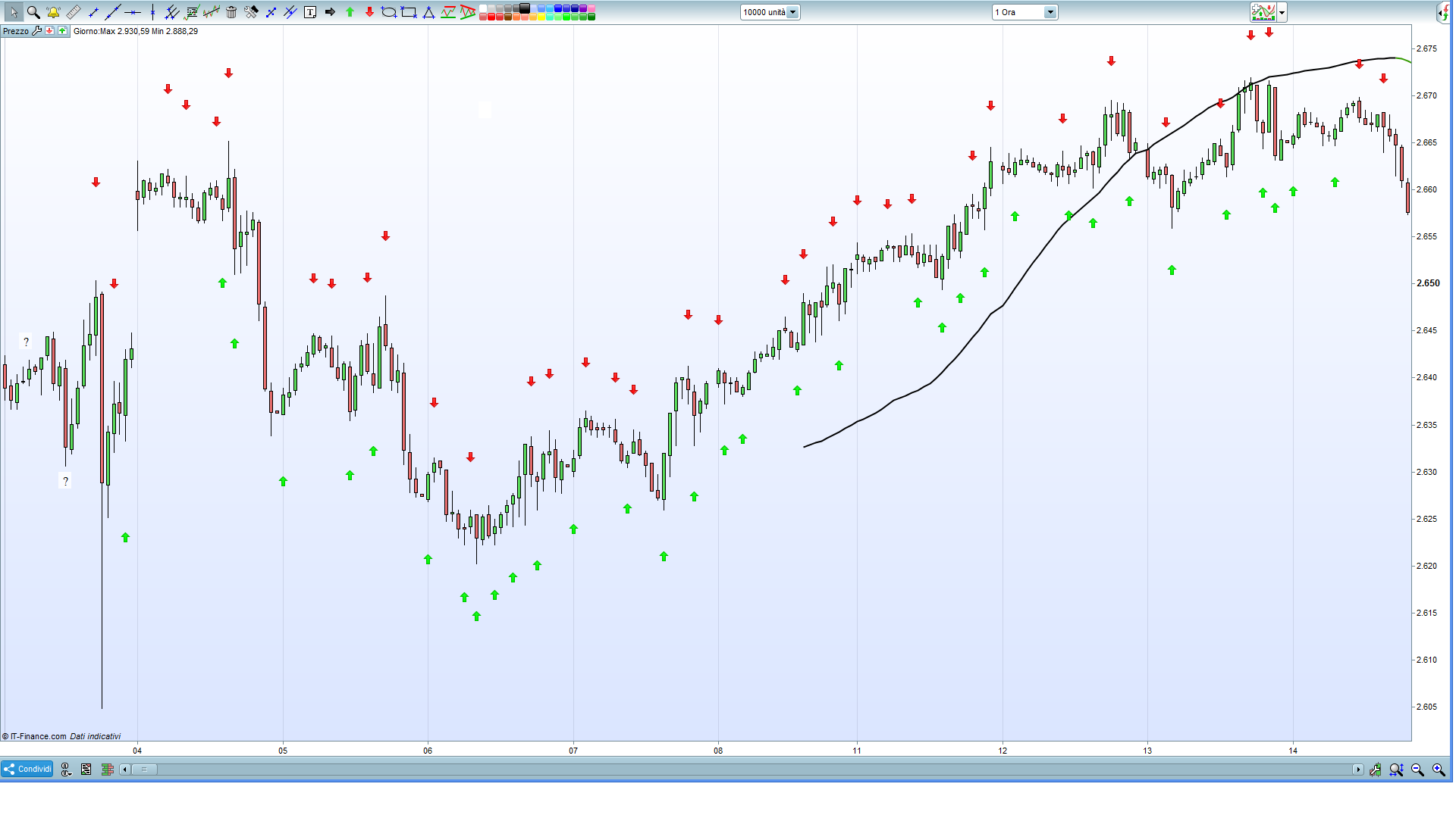 L’indicatore funziona ma non sempre. Ad esempio, applicato allo strumento US 500 Cash (1€) time frame 1 ora (10000 unità) non mette la frecia verde sotto la candela del 01/12/2017 ore 11:00. E, ancora, non mette la freccia rossa sopra la candela del 01/12/2017 ore 05:00. Mentre invece, dopo queste due date, non da più problemi.
