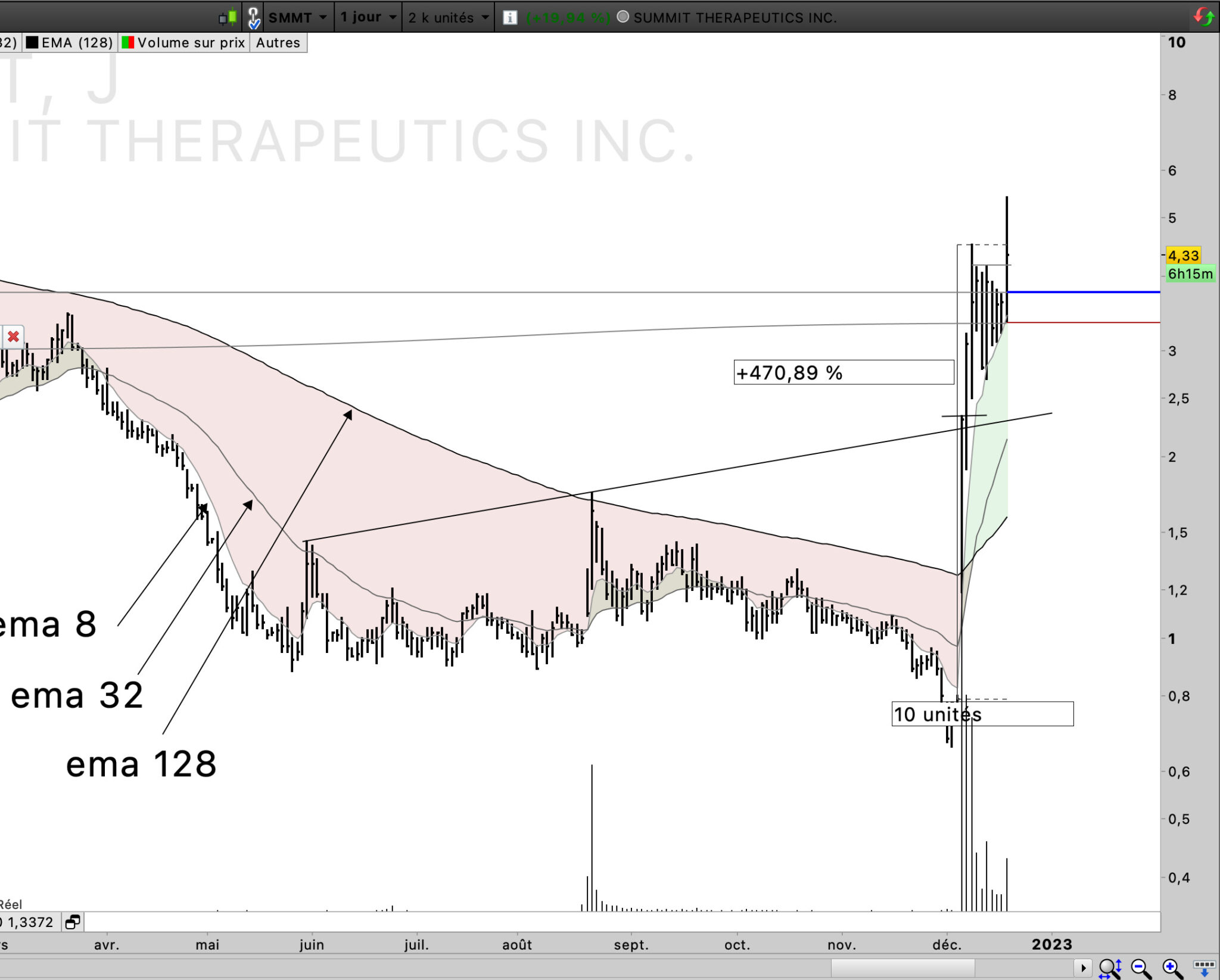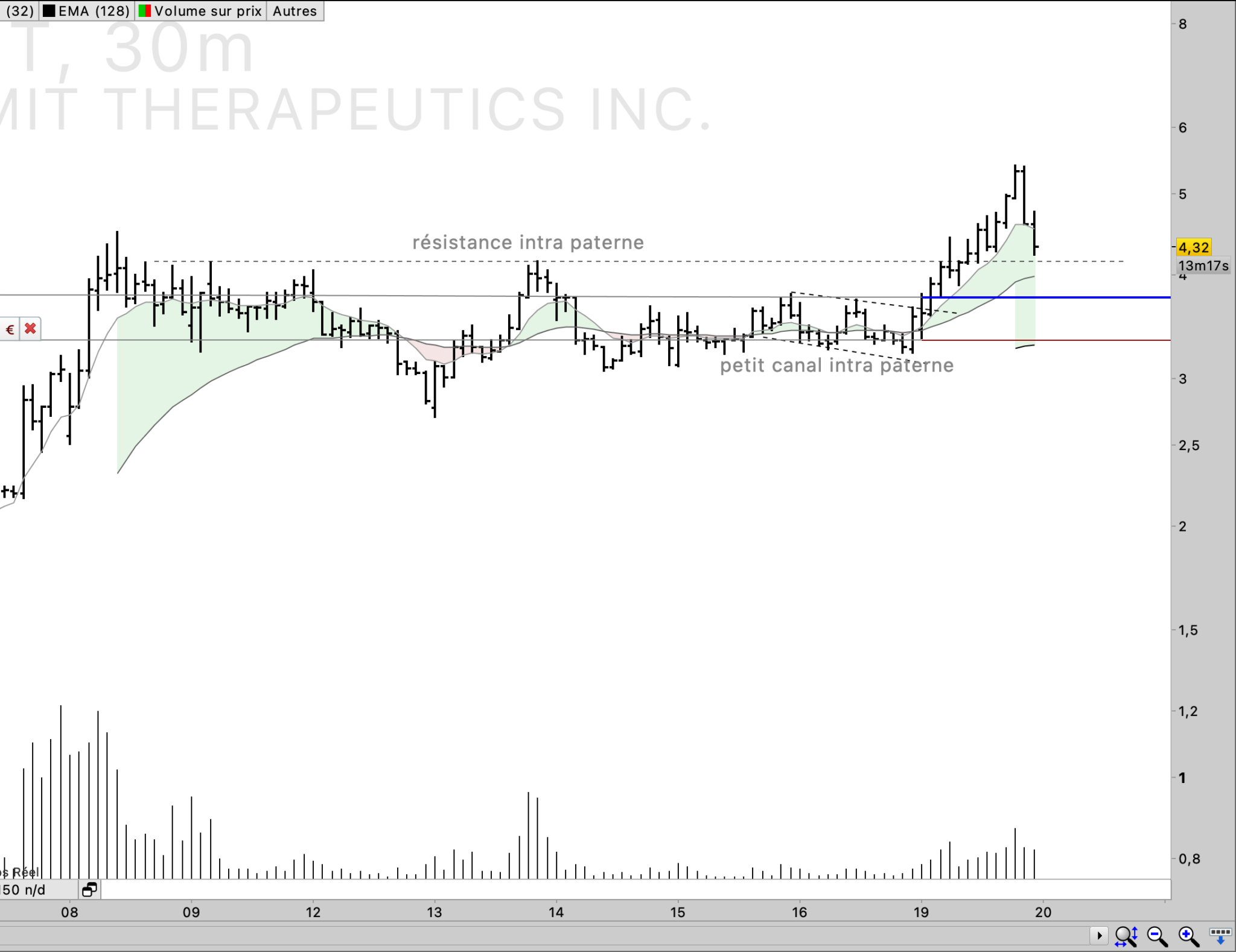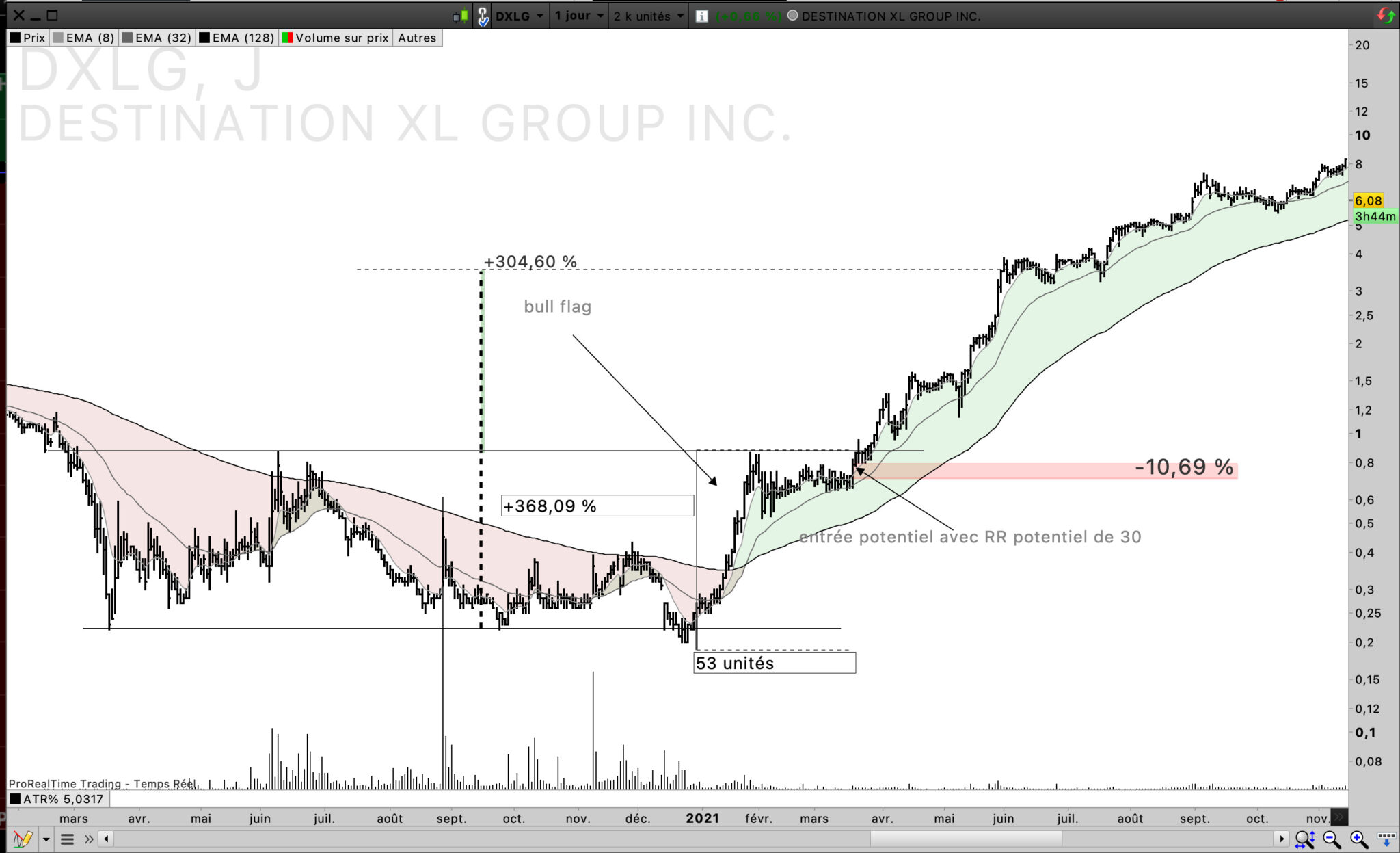 Donc j’entraine mes yeux à voir une hausse, forte au dessus de la ema 8 , d’au moins 10-15 barchart, puis un pullback sur la ema 32 (ema 8 de l’UT supérieur), et une contraction de la volatilité ( VCP de Mark Minervini) via à paterne chartiste, des plus bas de plus en plus haut, bloqué par un résistance intra paterne, et un breakout si ça veut bien.
