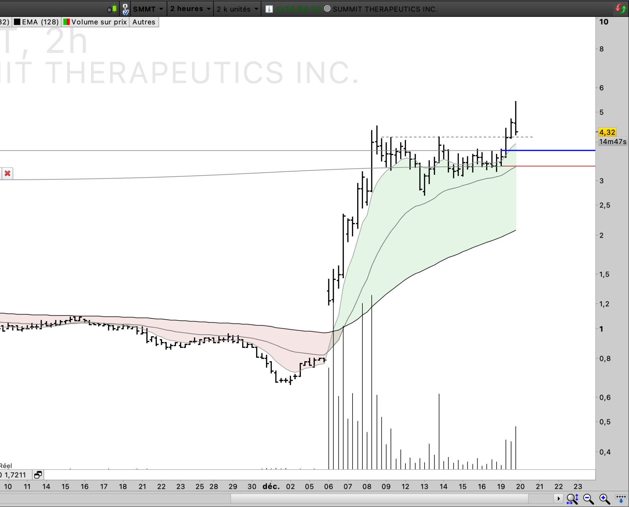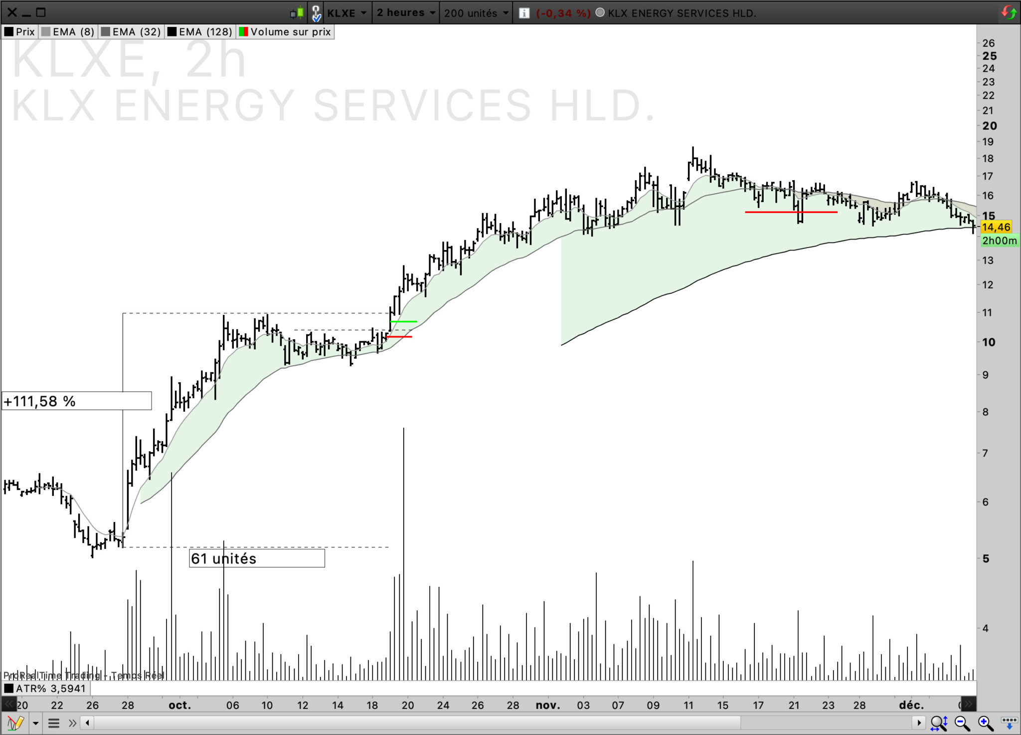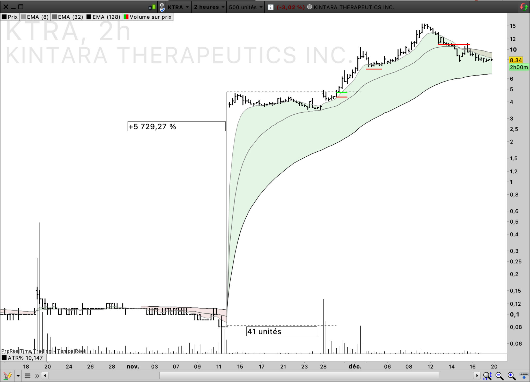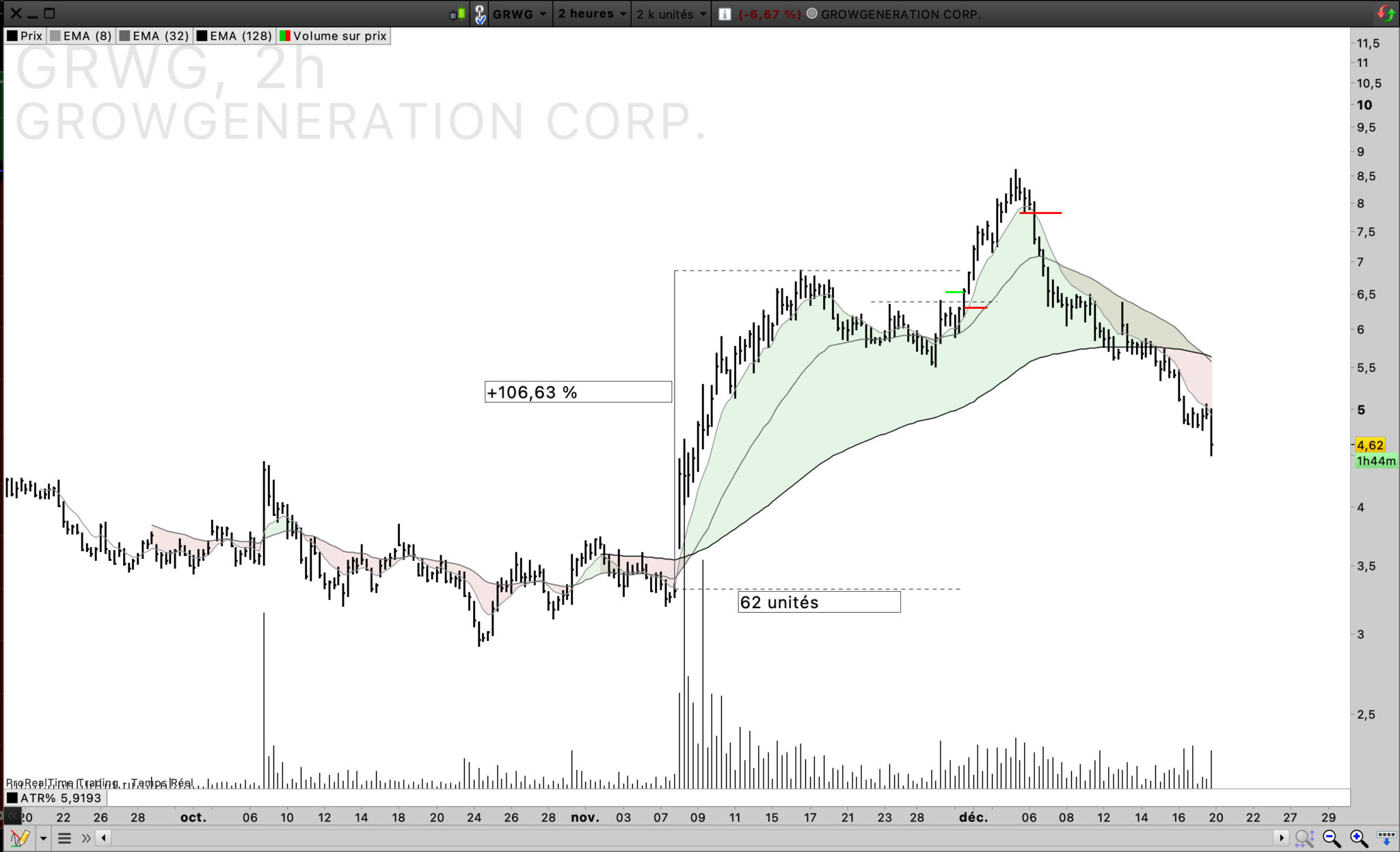 Donc j’entraine mes yeux à voir une hausse, forte au dessus de la ema 8 , d’au moins 10-15 barchart, puis un pullback sur la ema 32 (ema 8 de l’UT supérieur), et une contraction de la volatilité ( VCP de Mark Minervini) via à paterne chartiste, des plus bas de plus en plus haut, bloqué par un résistance intra paterne, et un breakout si ça veut bien.