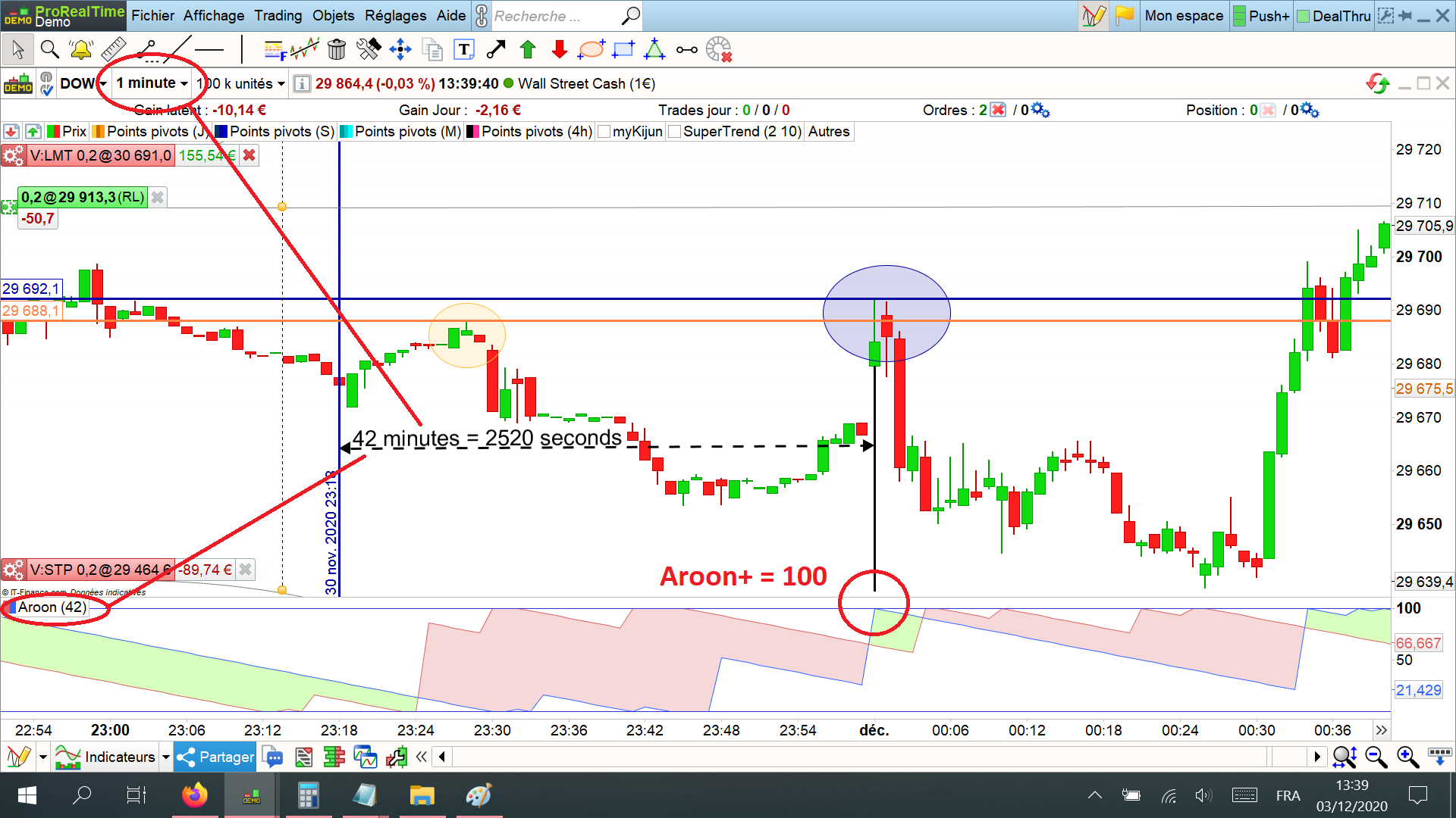 On the second screenshot, you may see that at the exact same time, the candle reaches the new high seen above but the Aroon+ indicator doesn’t change a bit (blue circle on the screenshot). It should have reached its highest high at 00:00:40.