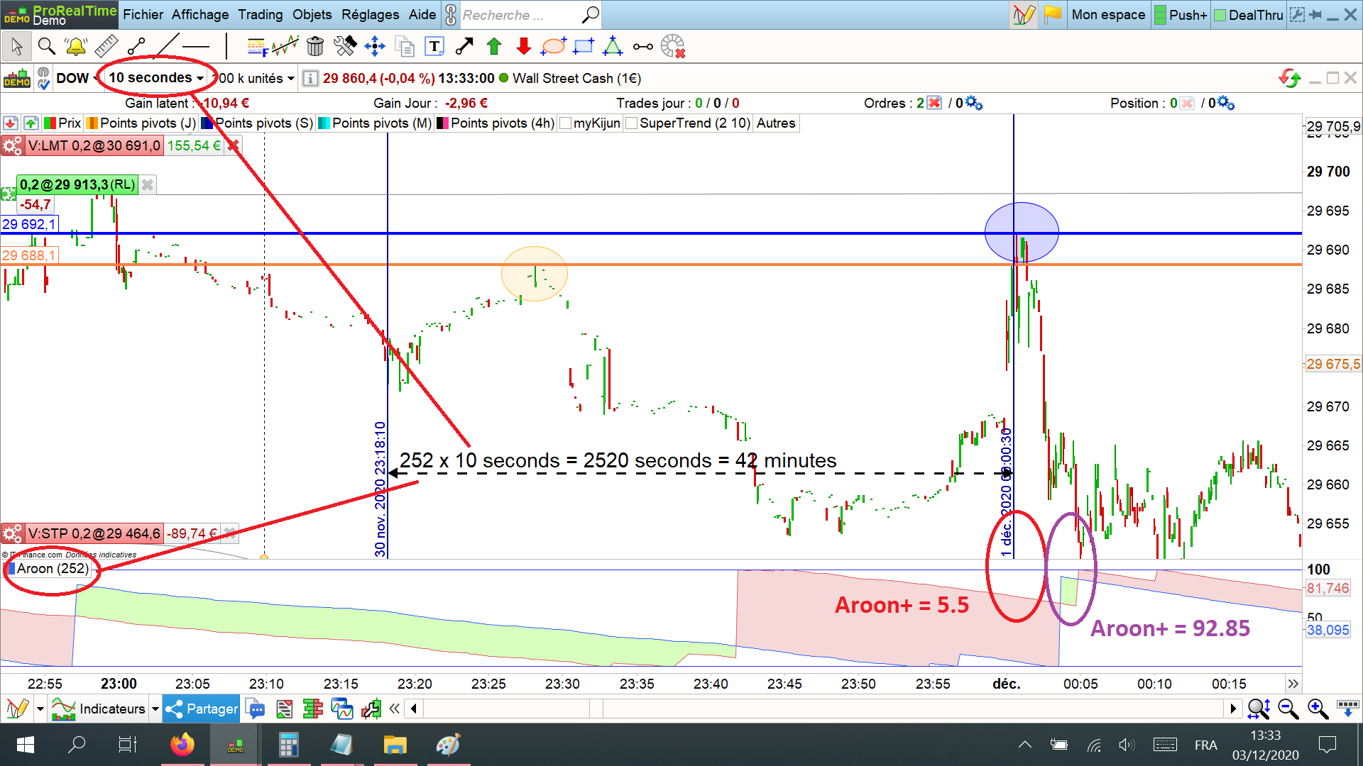 I then tried the Aroon+ on a 10-second timeframe with a period of 252 to match the above 1-minute period (252 x 10 sec = 2,520 seconds = 42 minutes).