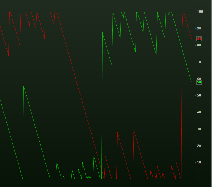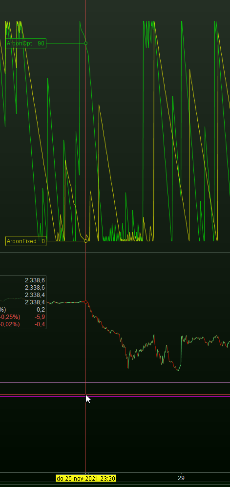 Just wondering … shouldn’t it be so that the 25 “periods of data” should be obeyed somehow ? Aroon[7] would not make much sense to me (or I can’t wrap my head aroond it). Just AroonDown[0] would tell you formally (?) whether its true (> 50 ??) for the past 25 highs. We could obviously compare that to AroonDown[7] (etc.) but *that* wouldn’t make sense inherently (although we obviously can derive from it what we want).