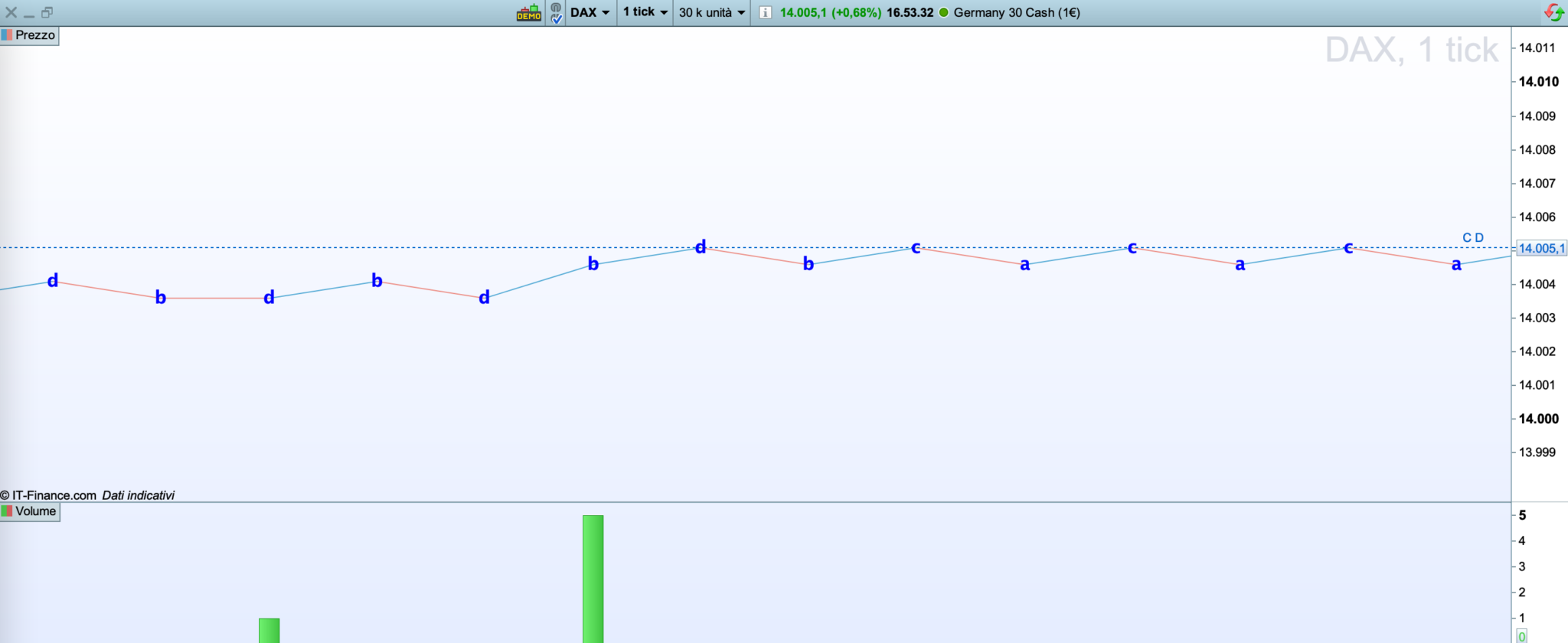 Try this one on one tick (I tryed on DAX), even more simple. And take a look at the image attached.