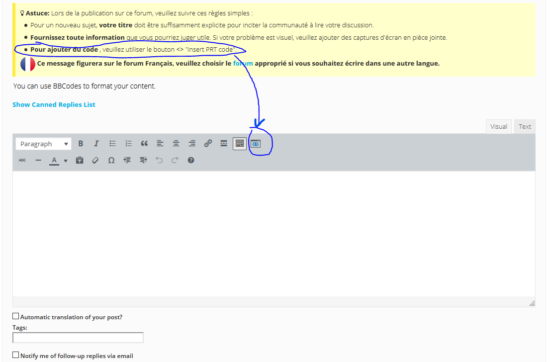 Je reformate le code du message ci-dessus au format PRT. Voir images ci-joint si on ne sait pas faire, à la fois là où c’était demandé “avant” si on ne retrouve plus les règles en haut des messages là où on avait l’habitude de les lire, et là où c’est demandé maintenant depuis la mise à jour récente.