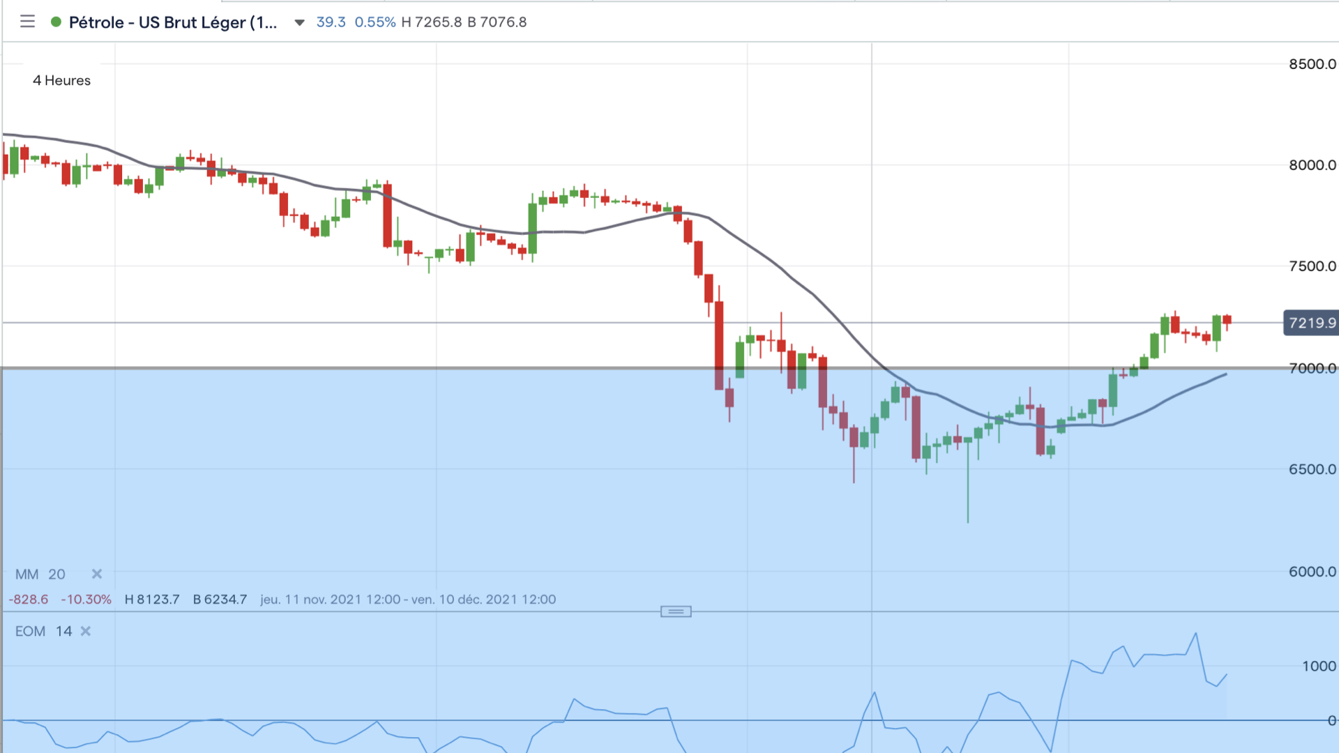 For example, the system opens a position (Oil – US Brut Market) under 7000 pts and close automatically the position above 7000 pts. In order to avoid in a choppiness environnement too often trades opened/closed I add a EMA that could cross under / above this level.