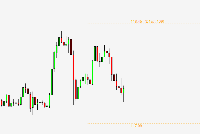 What I am trying to build is shown in the attached image. The picture is of a 1H chart (USDJPY today). The yellow lines are what I want to recreate. You can see the Upper line shows that the 20 period ATR taken from yesterday’s complete daily candle is 109 (D1atr=109).