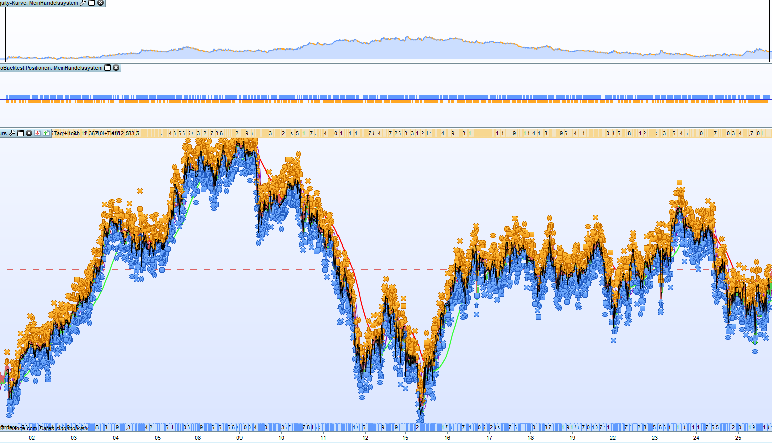 Wenn der Kurs das obere Band durchbricht wird gekauft (BUY) und wenn der Kurs das untere Band durchbricht wird verkauft (SHORTSELL). Die Stoploss werden jeweils an das obere und untere Band gesetzt. Sorry für meine schlechte Programmierkenntnisse…