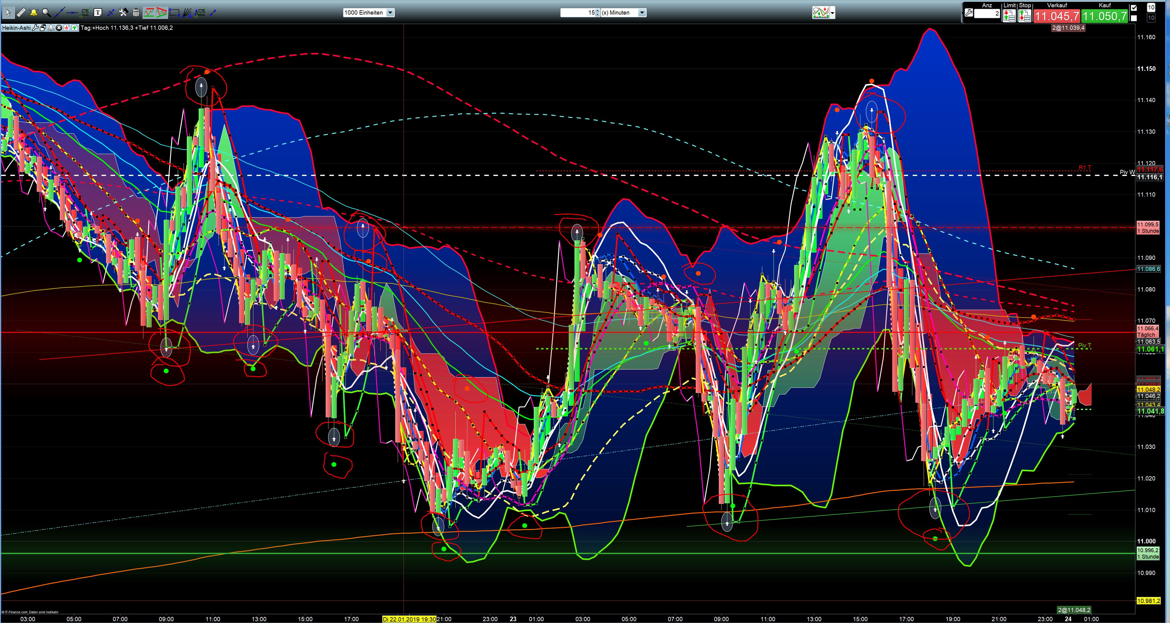 Here you see, that the quadratic semaphore signals (green and red dots) provide almost the same signals as the Wlliams fractals (ellipses). However, these signals appear more often also in between the absolute lows and highs.
