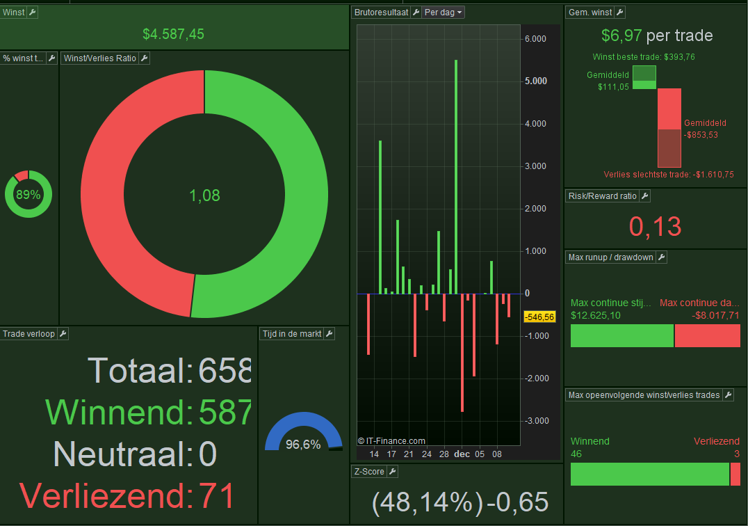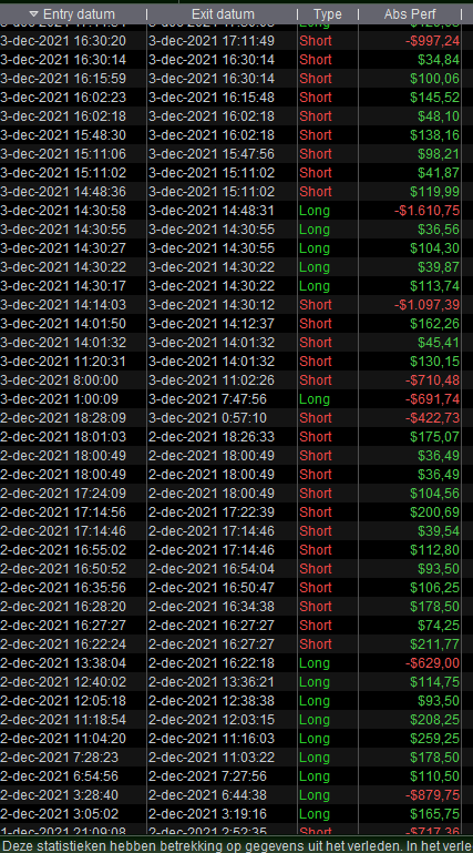 Always be careful that your (backtest) result does not spring from exceptionally good situations. The green spike of November 30 is such an example. “Why did it happen, how coincidental is it and how does it bias my idea of my system”. It is dangerous because it could color my net result green for this month, and the next month it may not be there and I am losing …